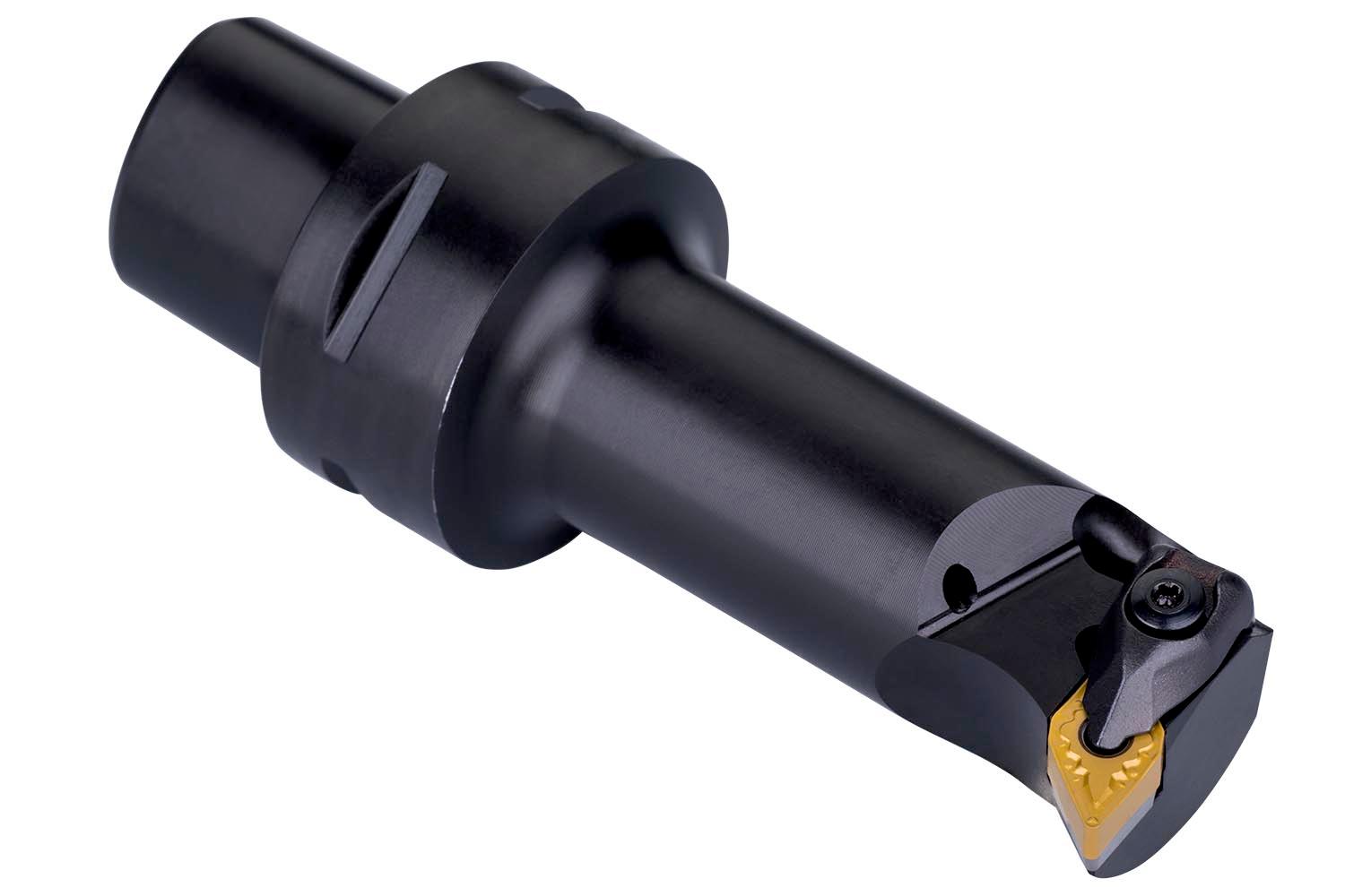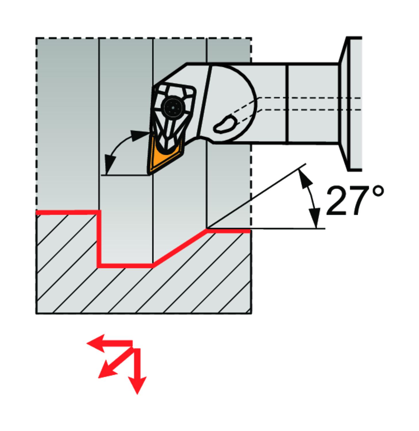 Double clamp boring bar for holding a 55° rhombus negative insert with an inscribed circle diameter of 9.525mm, 4.76mm thick (ISO designation DN.. 1104.. ), left hand 93° end cutting with off-set shank according to ISO 26623 (Polygon Shank Coupling) size C4, with 17mm funtional width and 90mm protruding length for internal chamfering, taper boring, single and multi-directional copy boring and longitudinal boring with and without shoulder