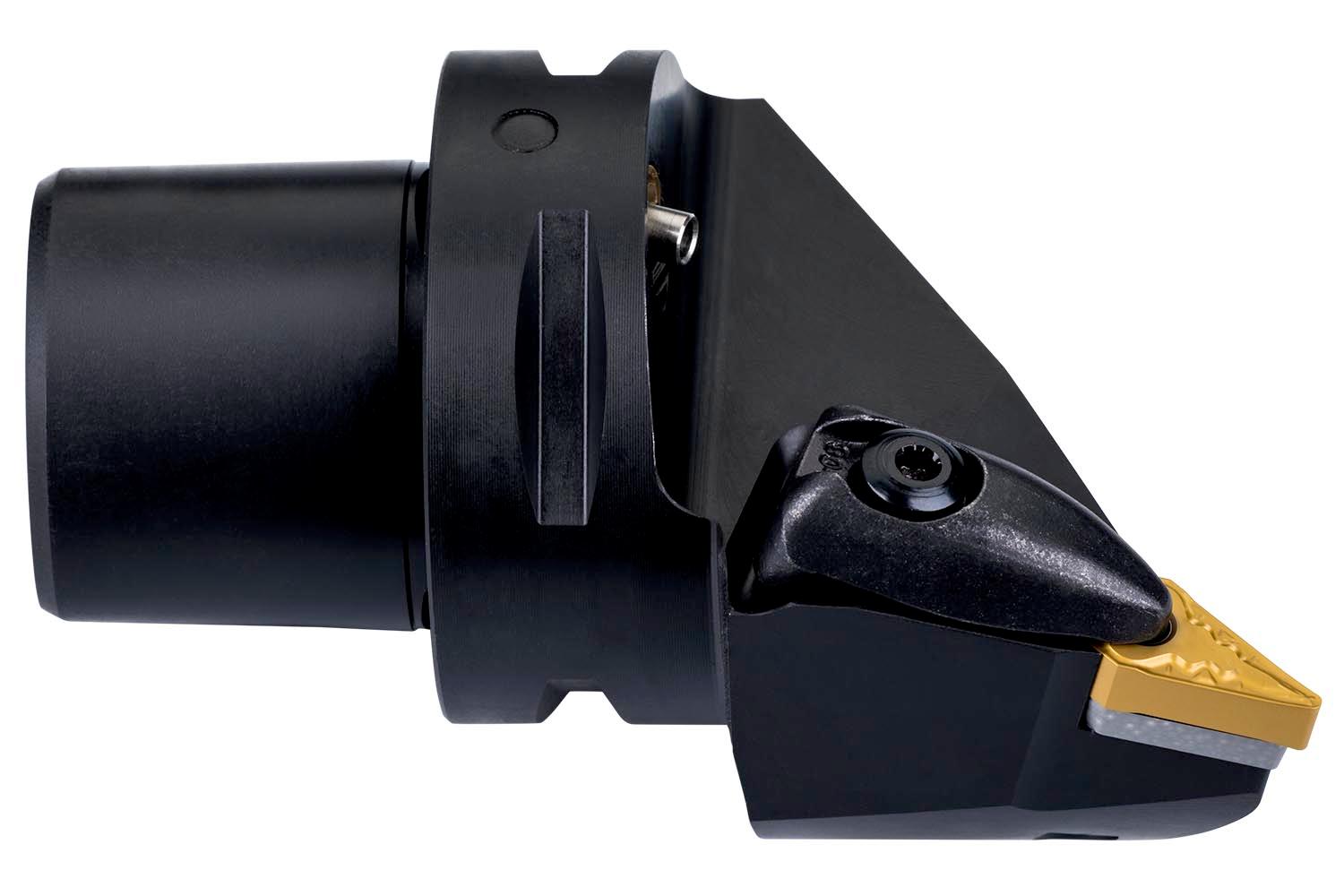 Double clamp turning tool for holding a 35° rhombus negative insert with an inscribed circle diameter of 9.525mm, 4.76mm thick (ISO designation VN.. 1604.. ), left hand 93° side cutting with off-set shank according to ISO 26623 (Polygon Shank Coupling) size C4, with 27mm funtional width and 62mm protruding length for chamfering, taper turning, single and multi-directional copy turning and longitudinal turning with and without shoulder