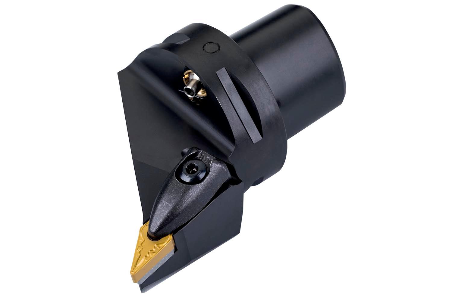 Double clamp turning tool for holding a 35° rhombus negative insert with an inscribed circle diameter of 9.525mm, 4.76mm thick (ISO designation VN.. 1604.. ), right hand 93° side cutting with off-set shank according to ISO 26623 (Polygon Shank Coupling) size C4, with 27mm funtional width and 62mm protruding length for chamfering, taper turning, single and multi-directional copy turning and longitudinal turning with and without shoulder
