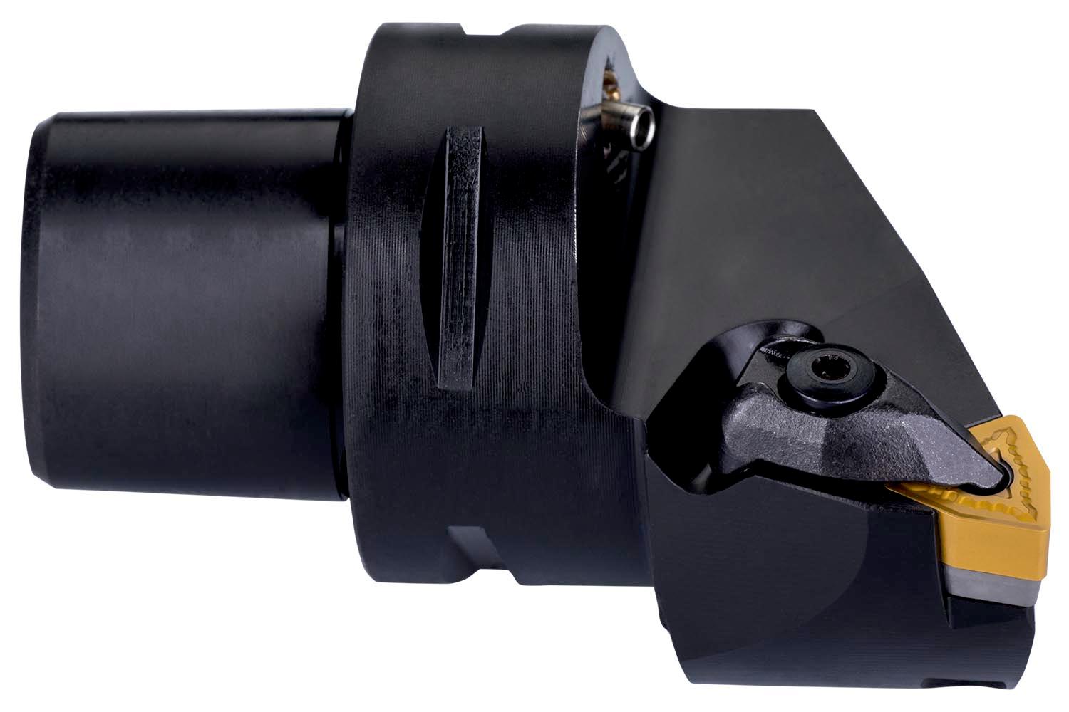 Double clamp turning tool for holding a 80° trigon negative insert with an inscribed circle diameter of 9.525mm, 4.76mm thick (ISO designation WN.. 0604.. ), left hand 95° side and end cutting with off-set shank according to ISO 26623 (Polygon Shank Coupling) size C4, with 27mm funtional width and 50mm protruding length for taper turning, face turning with and without shoulder and longitudinal turning with and without shoulder