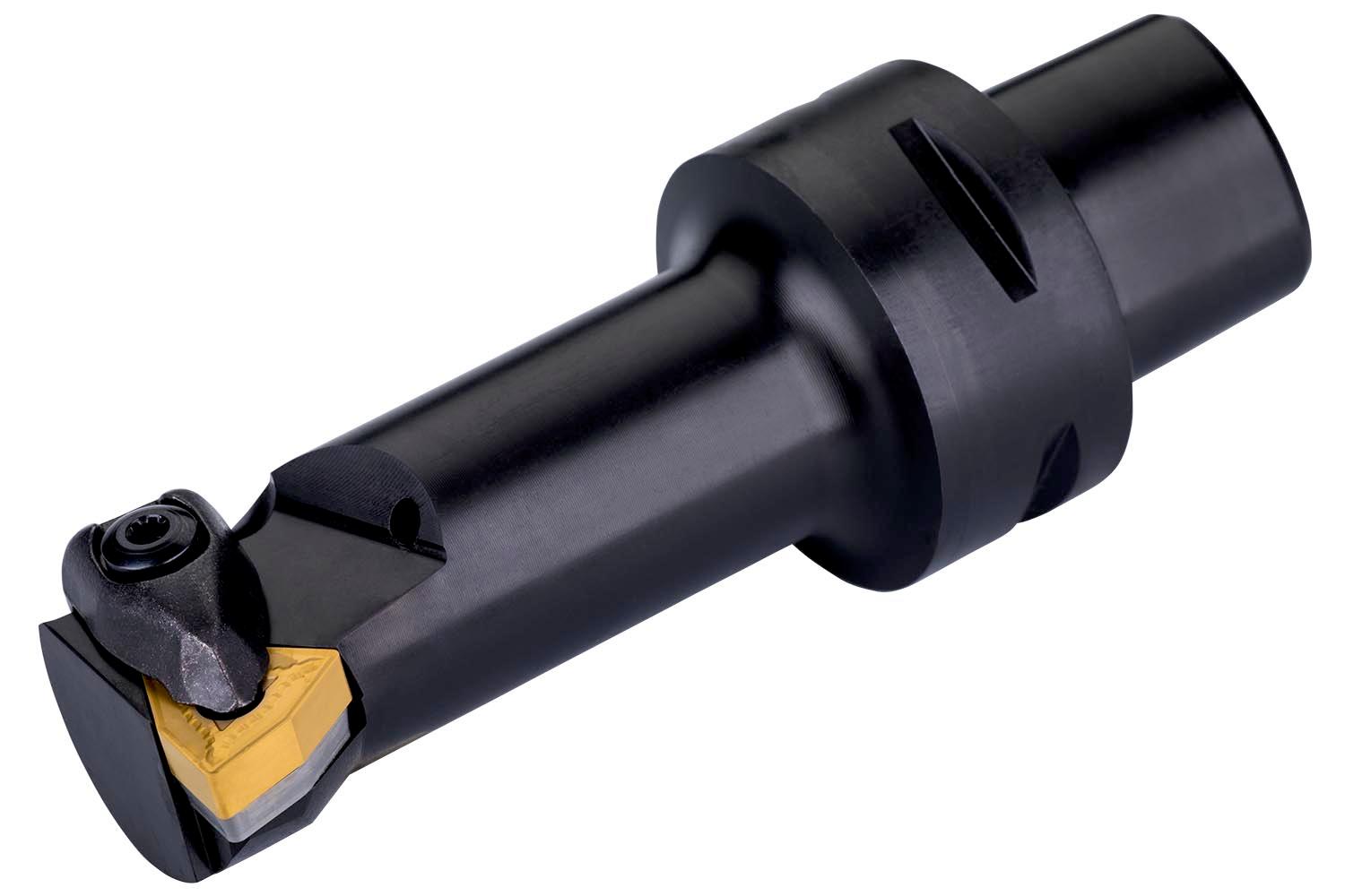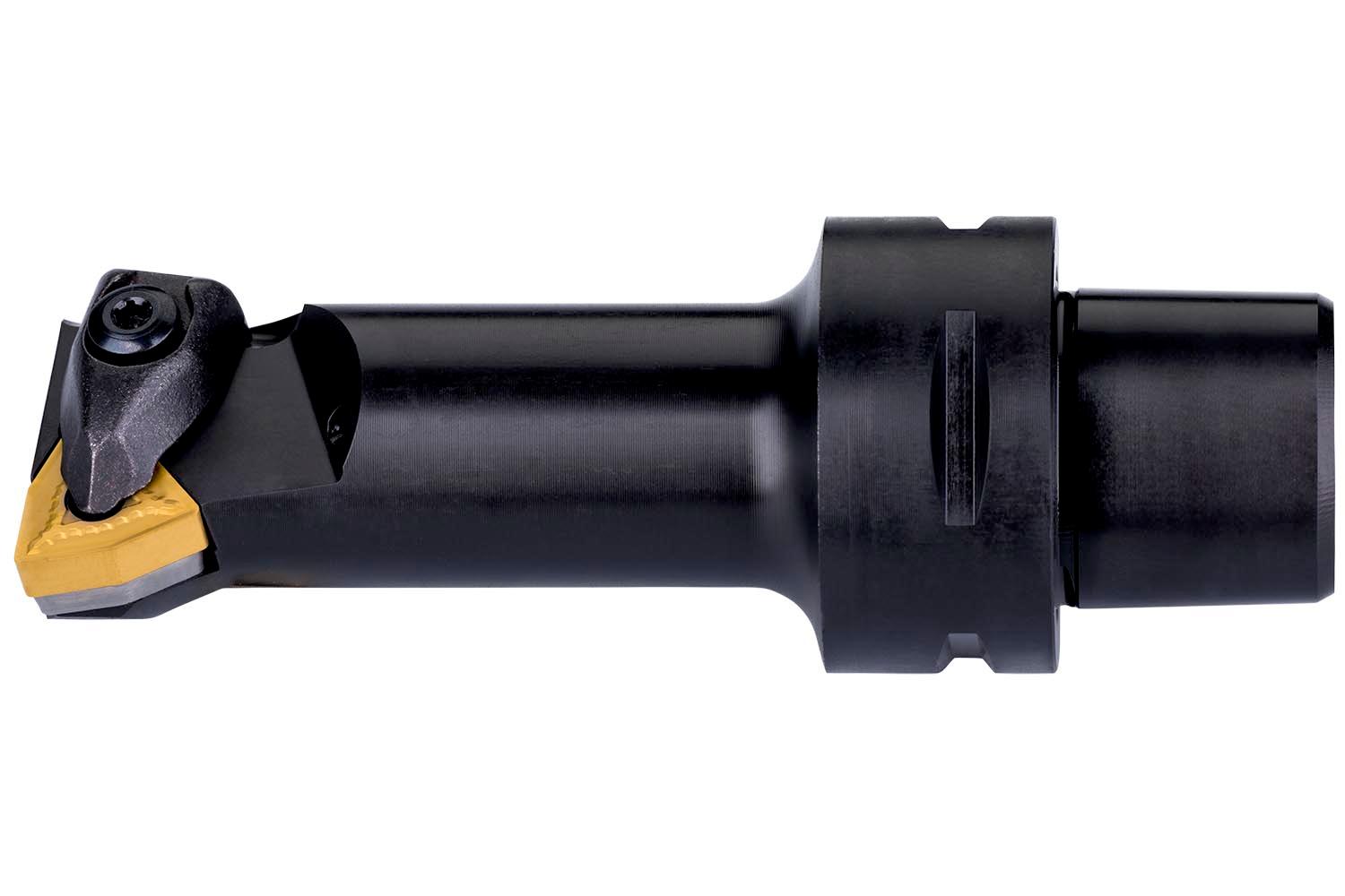 Double clamp boring bar for holding a 80° trigon negative insert with an inscribed circle diameter of 12.7mm, 4.76mm thick (ISO designation WN.. 0804.. ), right hand 95° side and end cutting with off-set shank according to ISO 26623 (Polygon Shank Coupling) size C4, with 17mm funtional width and 90mm protruding length for taper boring and longitudinal boring with and without shoulder