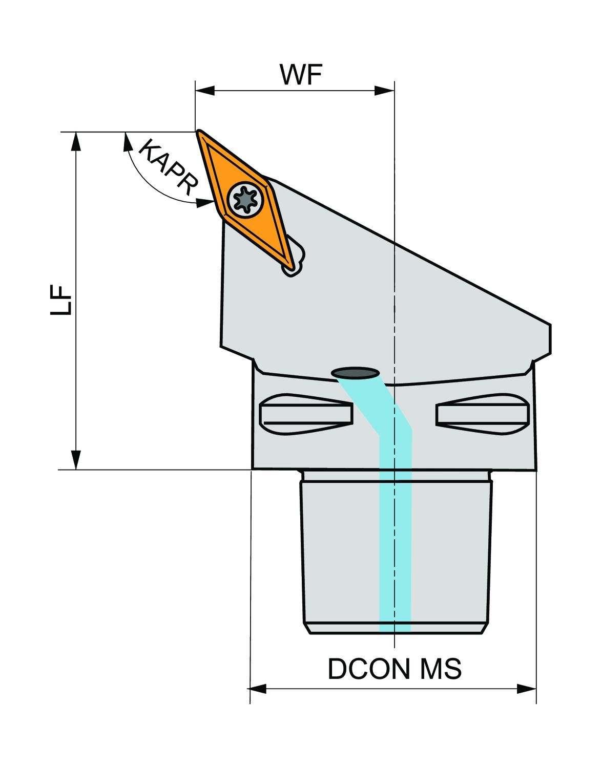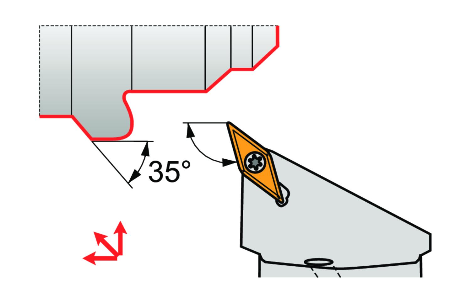 Screw clamp turning tool for holding a 35° rhombus positive insert with an inscribed circle diameter of 9.525mm, 4.76mm thick (ISO designation VB.. 1604.. or VC.. 1604.. ), left hand 107°30′ side cutting with off-set shank according to ISO 26623 (Polygon Shank Coupling) size C4, with 27mm funtional width and 50mm protruding length for taper turning, single and multi-directional copy turning and longitudinal turning with and without shoulder