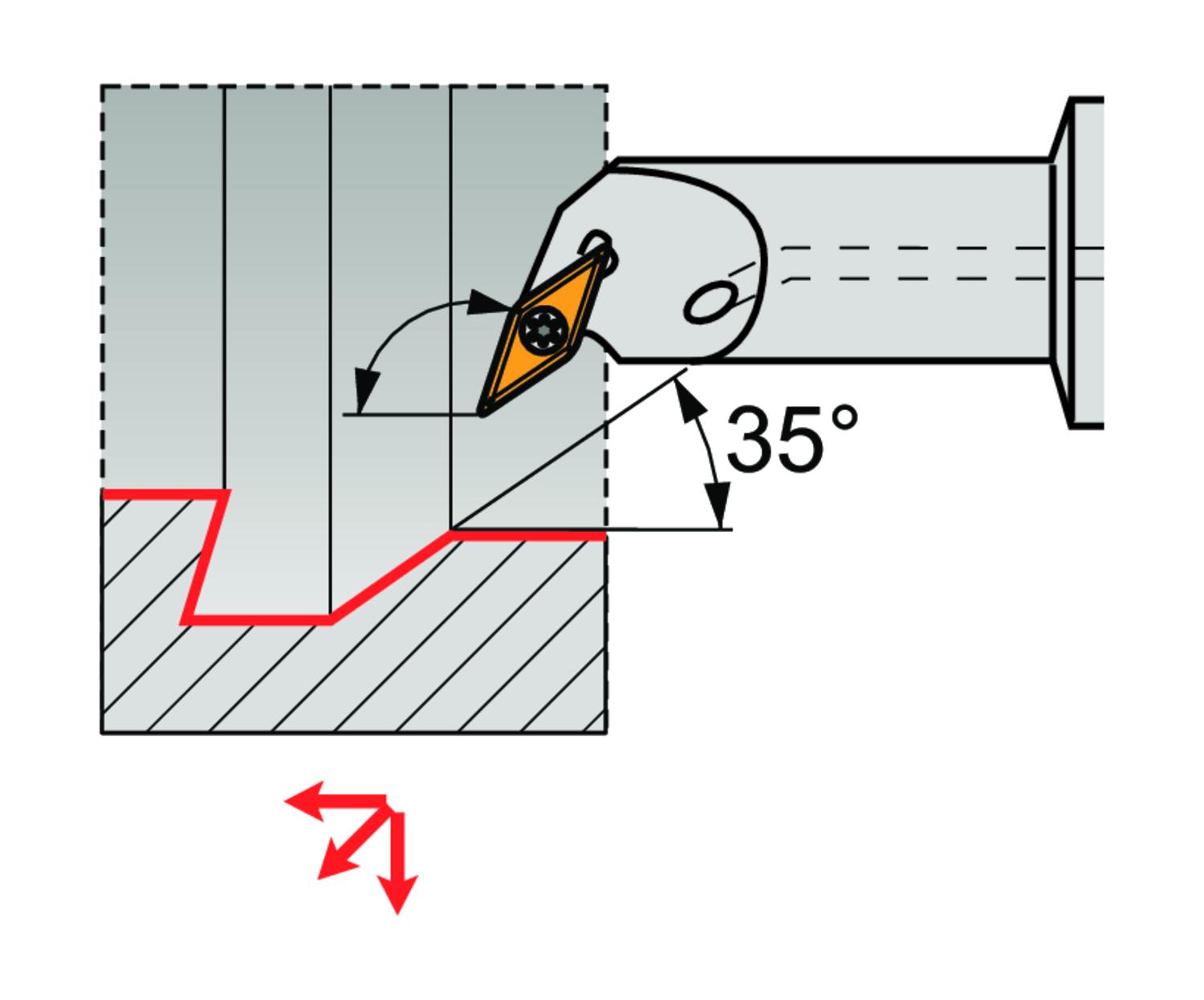 Screw clamp boring bar for holding a 35° rhombus positive insert with an inscribed circle diameter of 9.525mm, 4.76mm thick (ISO designation VB.. 1604.. or VC.. 1604.. ), right hand 107°30′ end cutting with off-set shank according to ISO 26623 (Polygon Shank Coupling) size C4, with 18mm funtional width and 90mm protruding length for single and multi-directional copy boring