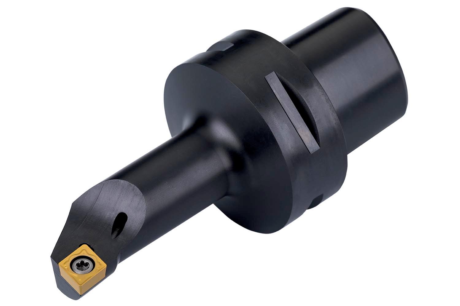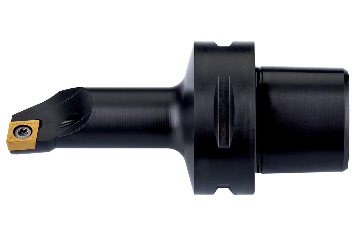 Screw clamp boring bar for holding a 80° rhombus positive insert with an inscribed circle diameter of 9.525mm, 3.97mm thick (ISO designation CC.. 09T3.. ), right hand 95° side and end cutting with off-set shank according to ISO 26623 (Polygon Shank Coupling) size C5, with 13mm funtional width and 80mm protruding length for taper boring and longitudinal boring with and without shoulder
