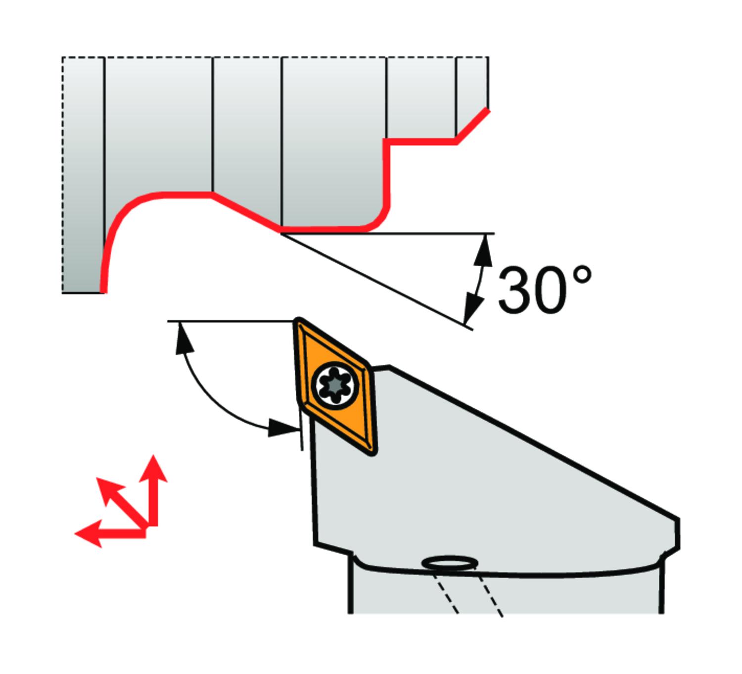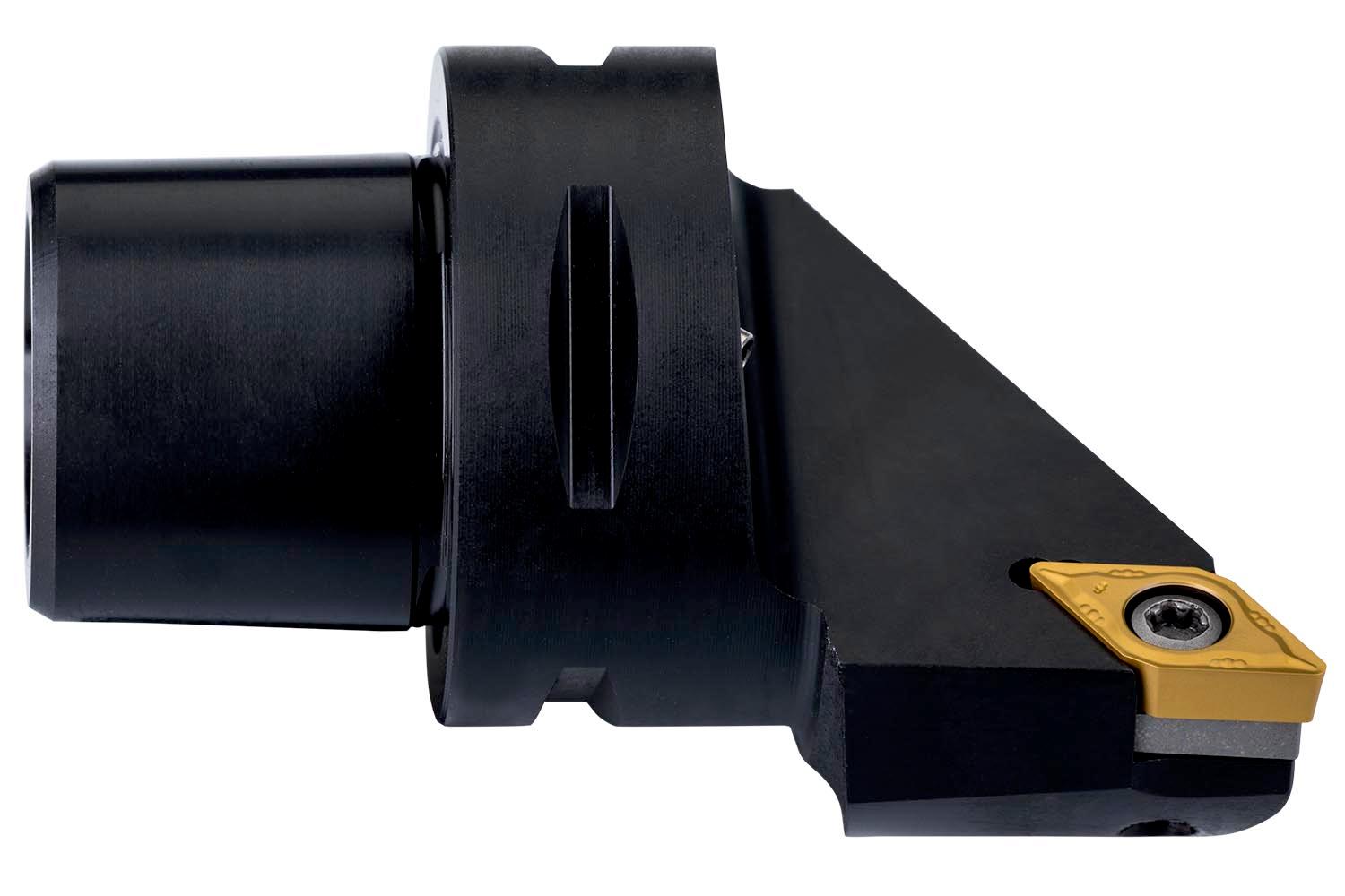 Screw clamp turning tool for holding a 55° rhombus positive insert with an inscribed circle diameter of 9.525mm, 3.97mm thick (ISO designation DC.. 11T3.. ), left hand 93° side cutting with off-set shank according to ISO 26623 (Polygon Shank Coupling) size C5, with 35mm funtional width and 60mm protruding length for chamfering, taper turning, single and multi-directional copy turning and longitudinal turning with and without shoulder