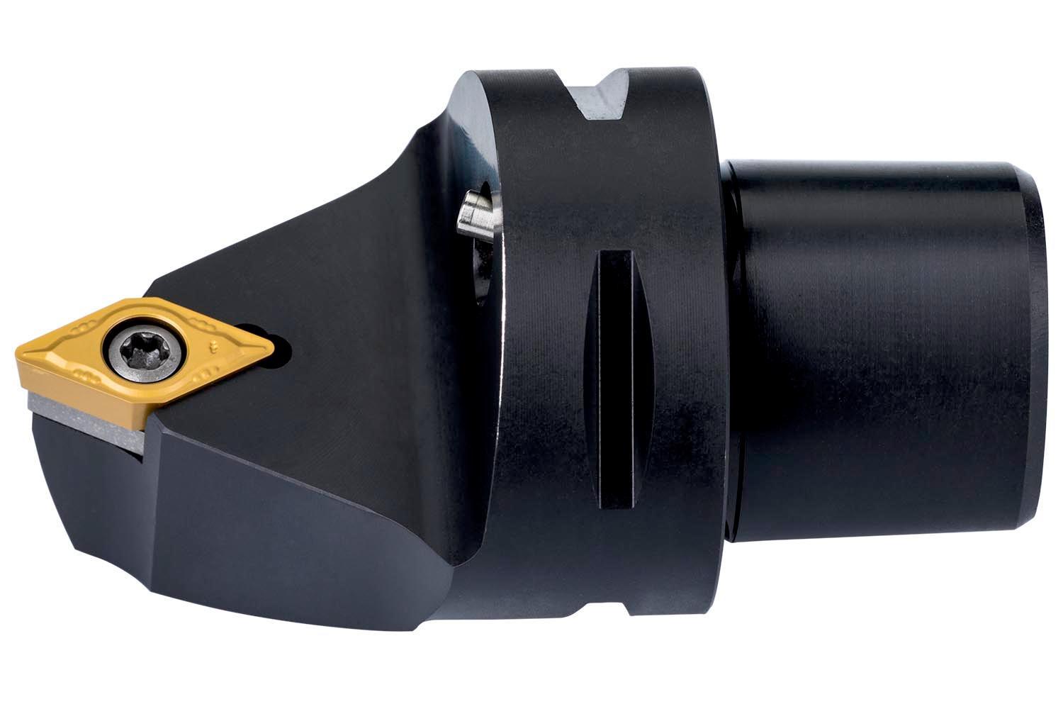 Screw clamp turning tool for holding a 55° rhombus positive insert with an inscribed circle diameter of 9.525mm, 3.97mm thick (ISO designation DC.. 11T3.. ), neutral hand 62°30′ side cutting with straight shank according to ISO 26623 (Polygon Shank Coupling) size C5, with 60mm protruding length for chamfering, taper turning, single and multi-directional copy turning and longitudinal turning without shoulder