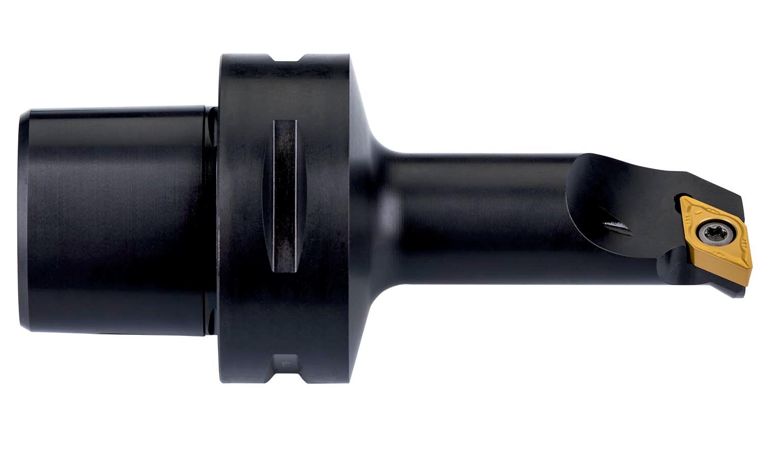 Screw clamp boring bar for holding a 55° rhombus positive insert with an inscribed circle diameter of 9.525mm, 3.97mm thick (ISO designation DC.. 11T3.. ), left hand 93° end cutting with off-set shank according to ISO 26623 (Polygon Shank Coupling) size C5, with 13mm funtional width and 80mm protruding length for taper boring, single and multi-directional copy boring and longitudinal boring with and without shoulder