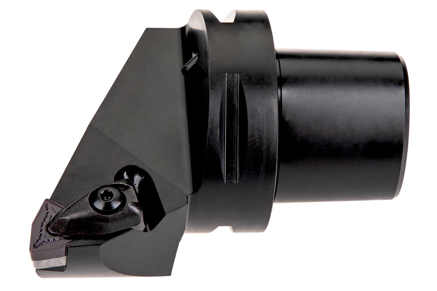 Double clamp turning tool for holding a 80° trigon negative insert with an inscribed circle diameter of 12.7mm, 4.76mm thick (ISO designation WN.. 0804.. ), right hand 95° side and end cutting with off-set shank according to ISO 26623 (Polygon Shank Coupling) size C6, with 45mm funtional width and 65mm protruding length for taper turning, face turning with and without shoulder and longitudinal turning with and without shoulder