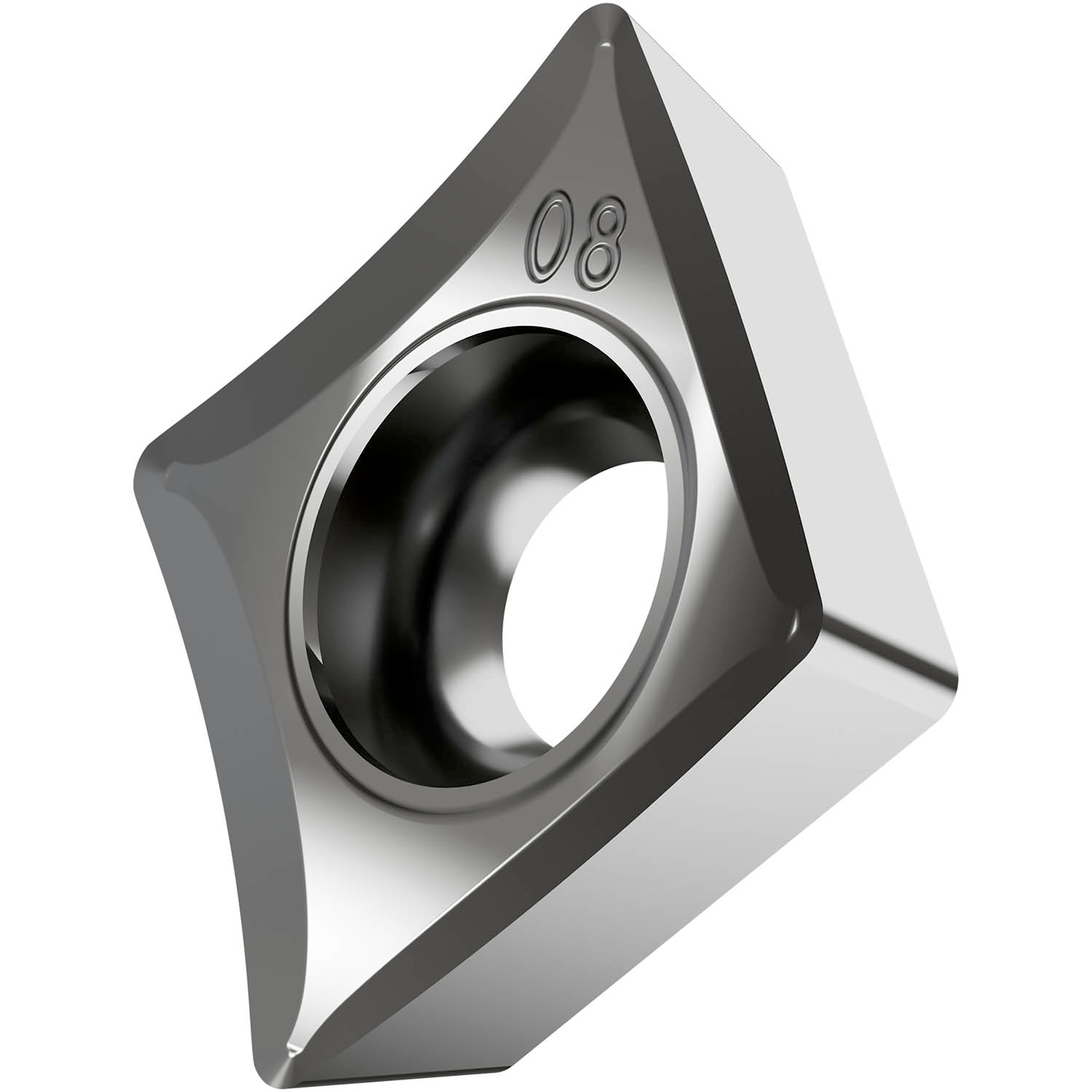 Single-sided positive turning insert, 80° rhomboid with 7° clearance, inscribed circle diameter of 9.525mm, 3.97mm thick, 0.8mm nose radius, indexing accuracy according to ISO-tolerance class-G, chip-breaker SF3 with rounded cutting edges, in grade H07, an uncoated WC-Co carbide within ISO ranges N10 -N30 and S01 -S20, for fine to medium machining of non-ferrous metals and super-alloys