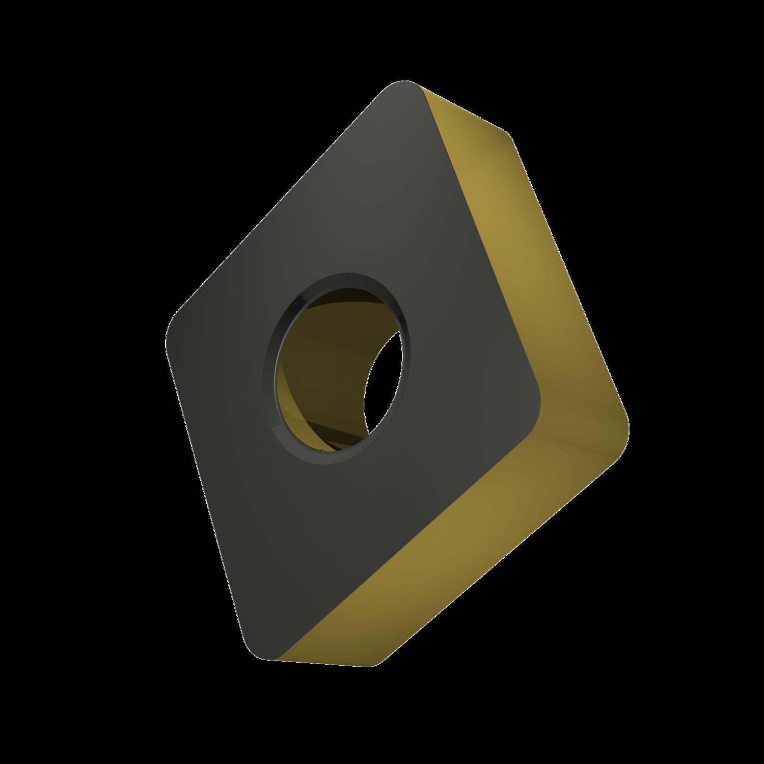 Double-sided negative turning insert, 80° rhomboid, nose radius, with an indexing accuracy according to ISO-tolerance class-M, coated WC-Co carbide.