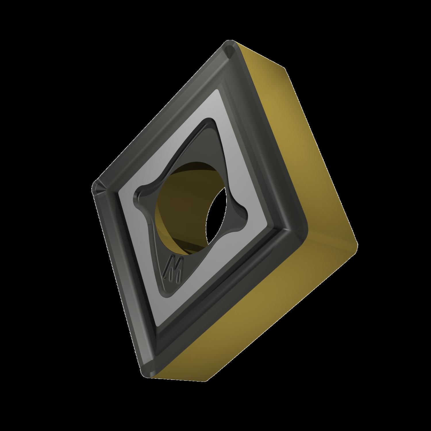 Double-sided negative turning insert, 80° rhomboid with inscribed circle diameter of 12.7mm, 4.76mm thick, 0.8mm nose radius, indexing accuracy according to ISO-tolerance class-M, chip-breaker MR with WIPER edge design, in grade T9415, a MT-CVD coated functionally graded WC-Co carbide within ISO range P05 -P30, for medium to heavy machining of steels