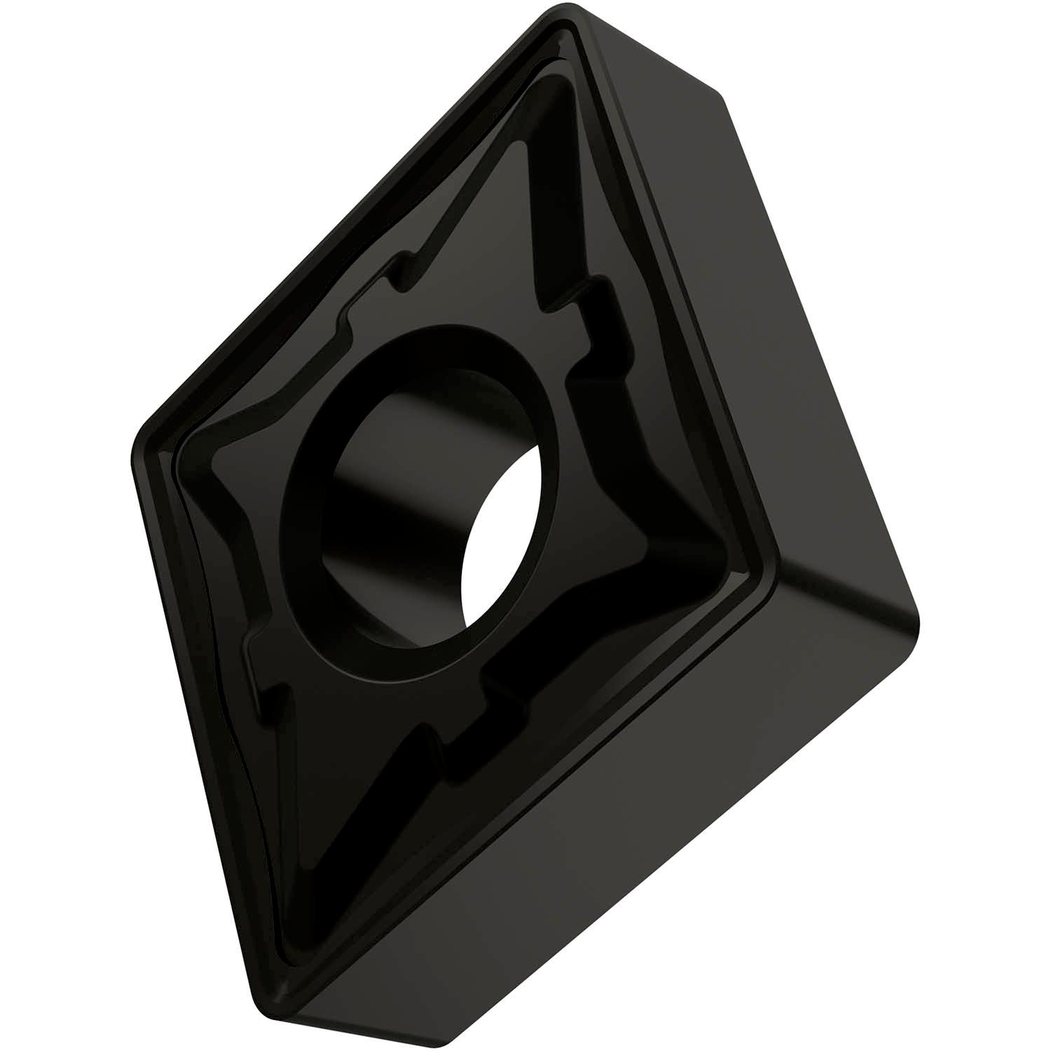 Double-sided negative turning insert, 80° rhomboid with inscribed circle diameter of 12.7mm, 4.76mm thick, 1.2mm nose radius, indexing accuracy according to ISO-tolerance class-M, chip-breaker R with rounded cutting edges, in grade T9325, a MT-CVD coated functionally graded WC-Co carbide within ISO range P15 -P35, for medium to heavy machining of steels