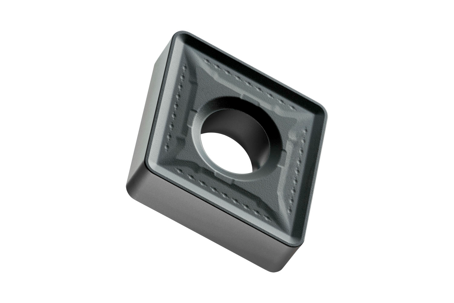 Double-sided negative turning insert, 80° rhomboid with inscribed circle diameter of 19.05mm, 6.35mm thick, 1.6mm nose radius and indexing accuracy according to ISO-tolerance class-M, chip-breaker HR2, in grade T9335, a MT-CVD coated functionally graded WC-Co carbide within ISO range P20 -P45, for heavy to extra heavy machining of steels