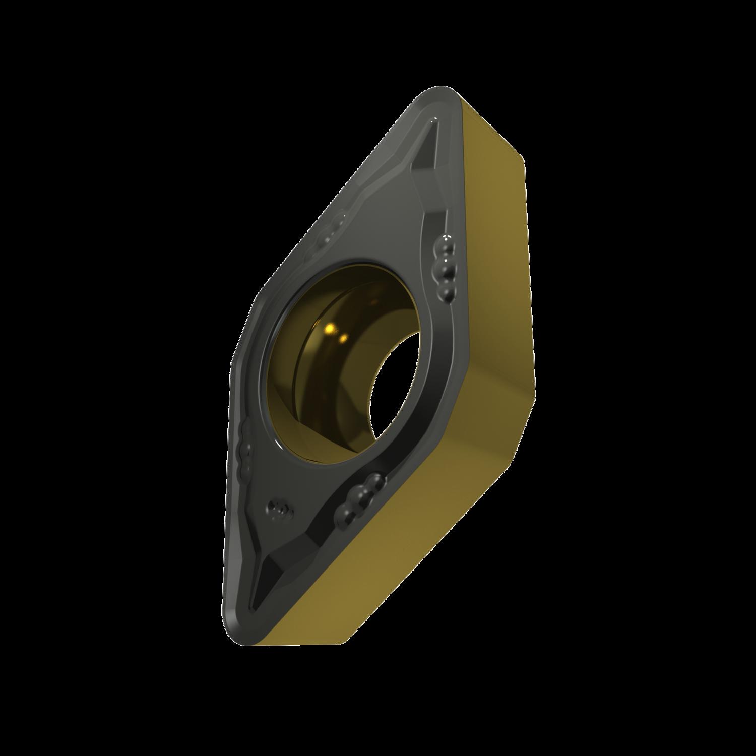 Single-sided positive turning insert, 55° rhomboid with 7° clearance, inscribed circle diameter of 9.525mm, 3.97mm thick, 1.2mm nose radius, indexing accuracy according to ISO-tolerance class-M, chip-breaker FM with rounded cutting edges, in grade T9415, a MT-CVD coated functionally graded WC-Co carbide within ISO range P05 -P30, for fine to medium machining of stee