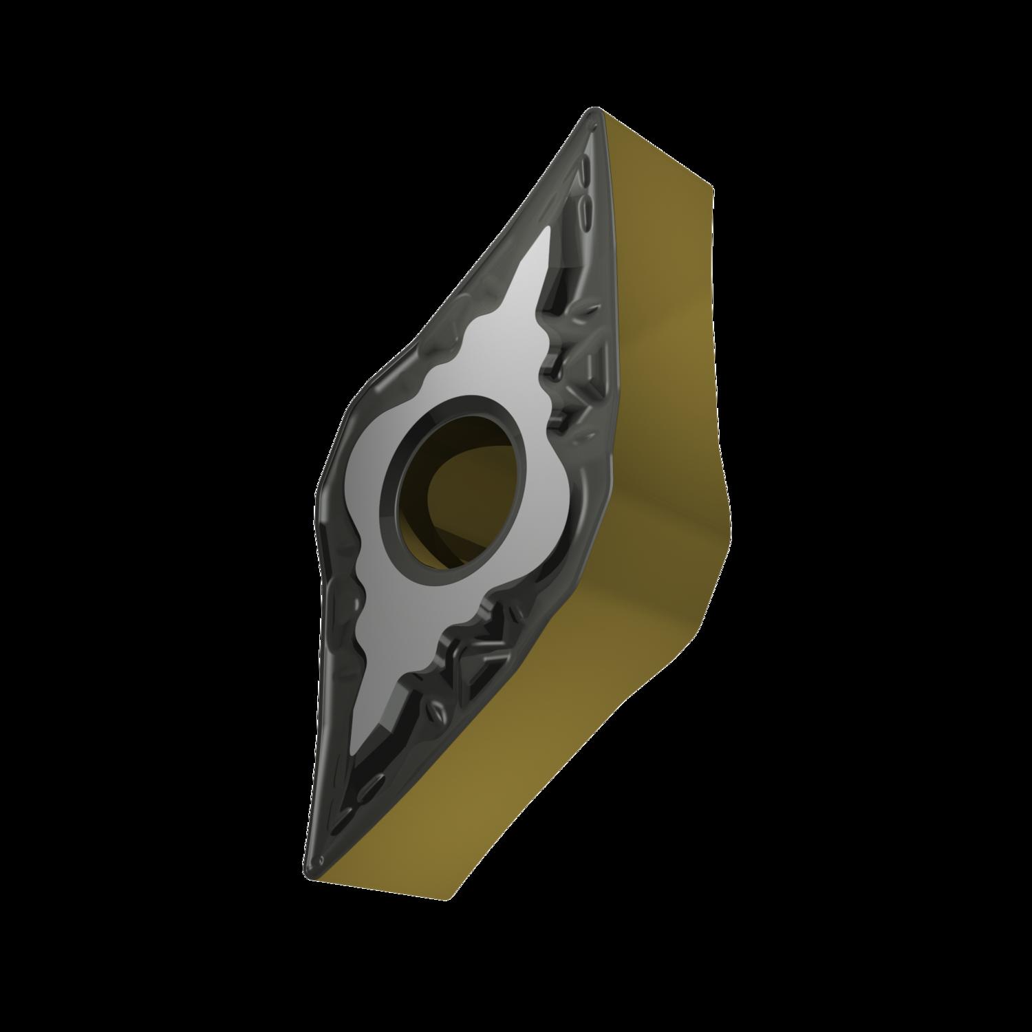 Double-sided negative turning insert, 55° rhomboid with inscribed circle diameter of 9.525mm, 4.76mm thick, 0.4mm nose radius, indexing accuracy according to ISO-tolerance class-M, chip-breaker FM with rounded cutting edges, in grade T9415, a MT-CVD coated functionally graded WC-Co carbide within ISO range P05 -P30, for fine to medium machining of steels