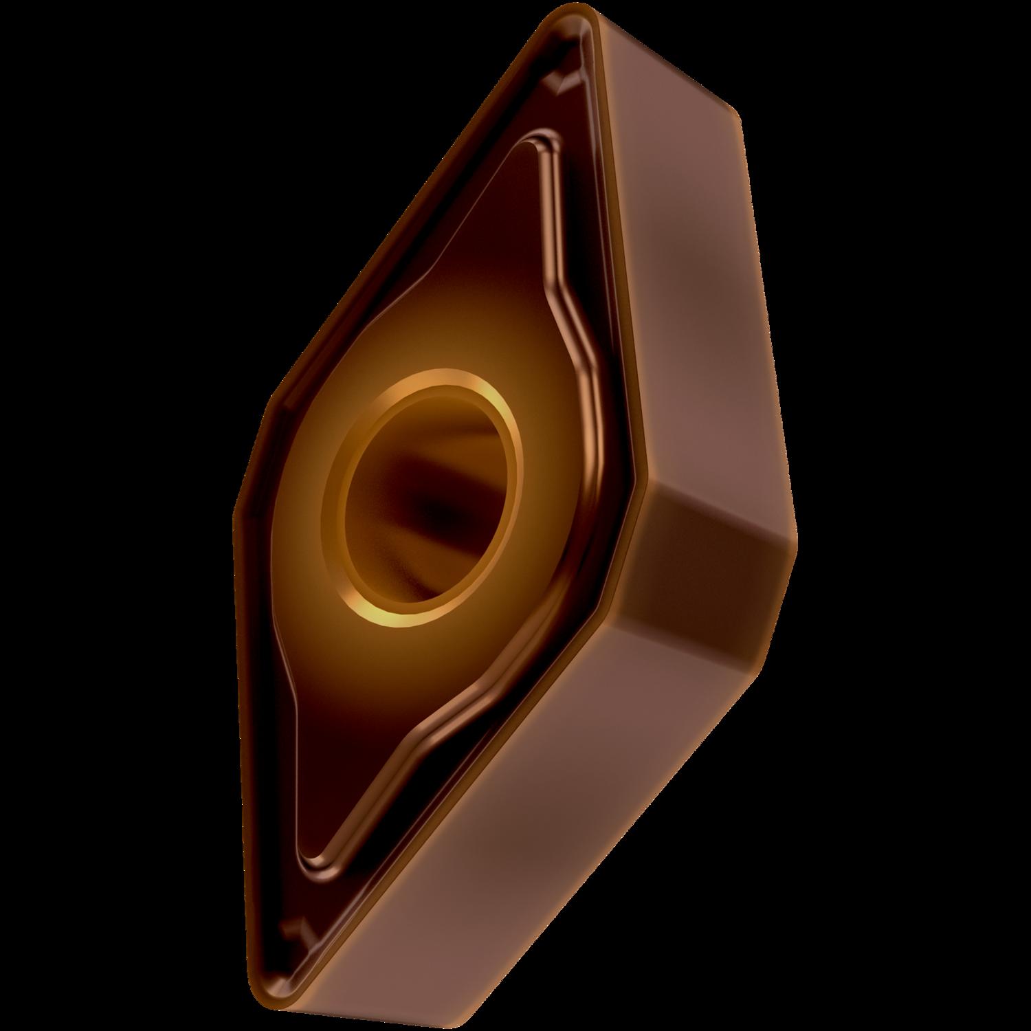 Double-sided negative turning insert, 55° rhomboid with inscribed circle diameter of 9.525mm, 4.76mm thick, 0.4mm nose radius, indexing accuracy according to ISO-tolerance class-M, chip-breaker NM with rounded cutting edges, in grade T8430, a PVD coated fine grained WC-Co carbide within ISO ranges P20 -P40 and M20 -M35, for fine to heavy machining of steels and stainless-steels