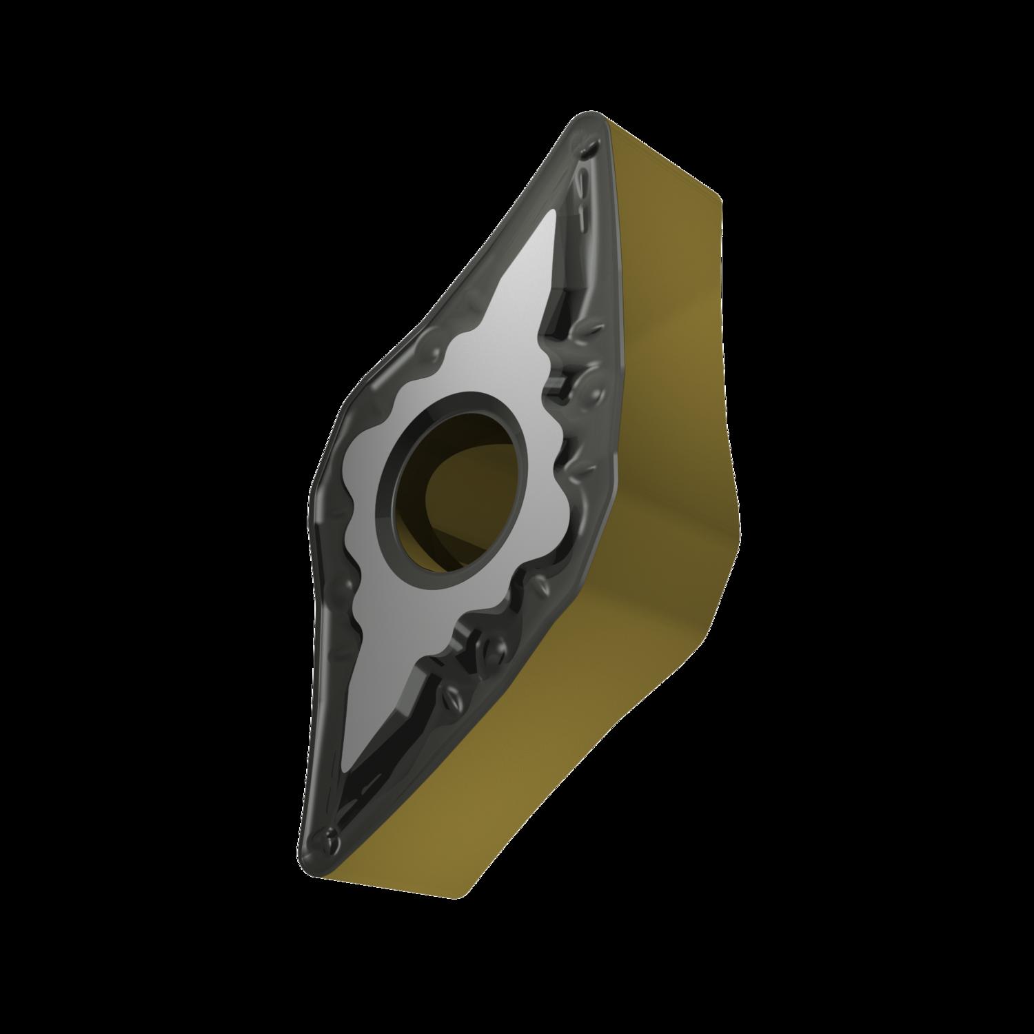 Double-sided negative turning insert, 55° rhomboid with inscribed circle diameter of 9.525mm, 4.76mm thick, 0.8mm nose radius, indexing accuracy according to ISO-tolerance class-M, chip-breaker FM with rounded cutting edges, in grade T9415, a MT-CVD coated functionally graded WC-Co carbide within ISO range P05 -P30, for fine to medium machining of steels