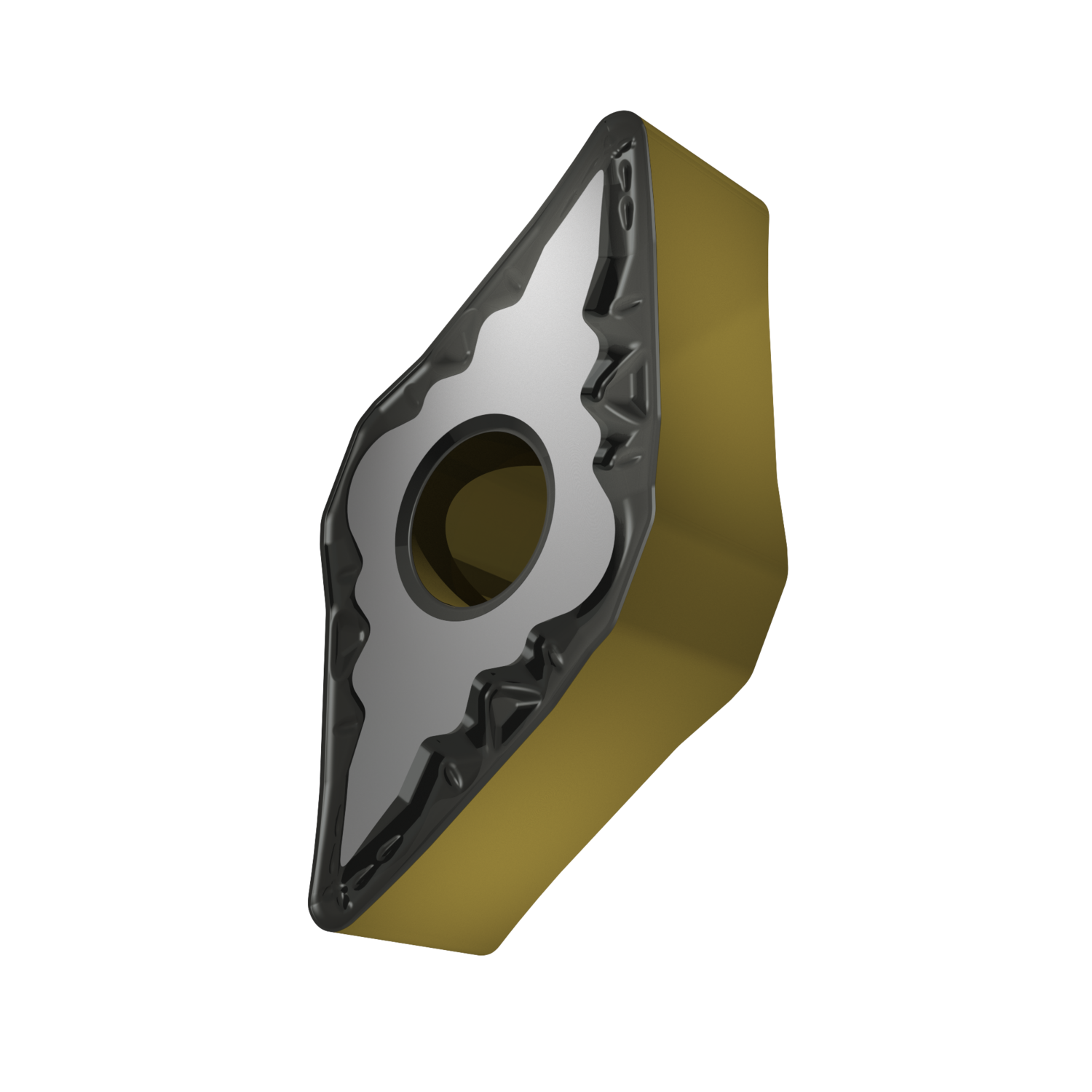 Double-sided negative turning insert, 55° rhomboid with inscribed circle diameter of 12.7mm, 6.35mm thick, 1.2mm nose radius, indexing accuracy according to ISO-tolerance class-M, chip-breaker FM with rounded cutting edges, in grade T9415, a MT-CVD coated functionally graded WC-Co carbide within ISO range P05 -P30, for fine to medium machining of steels