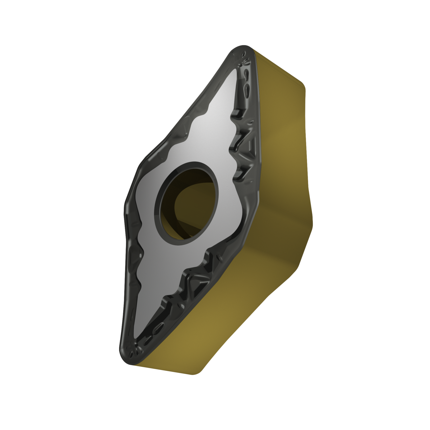 Double-sided negative turning insert, 55° rhomboid with inscribed circle diameter of 12.7mm, 6.35mm thick, 1.6mm nose radius, indexing accuracy according to ISO-tolerance class-M, chip-breaker FM with rounded cutting edges, in grade T9415, a MT-CVD coated functionally graded WC-Co carbide within ISO range P05 -P30, for fine to medium machining of steels