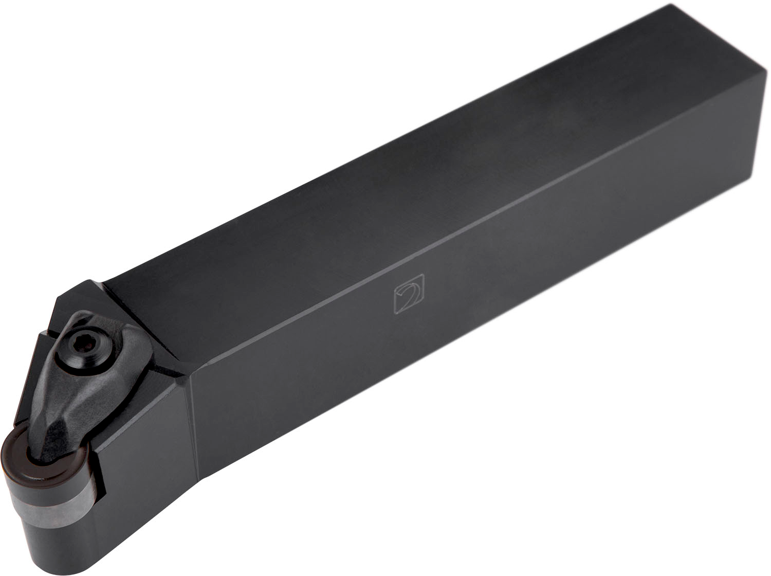 Double clamp turning tool for holding a round negative insert with a diameter of 12.7mm, 4.76mm thick (ISO designation RN.. 120400 ), right hand side cutting with off-set shank, 25mm tool height x 25mm width x 150mm long for taper turning, face turning without shoulder and longitudinal turning without shoulder