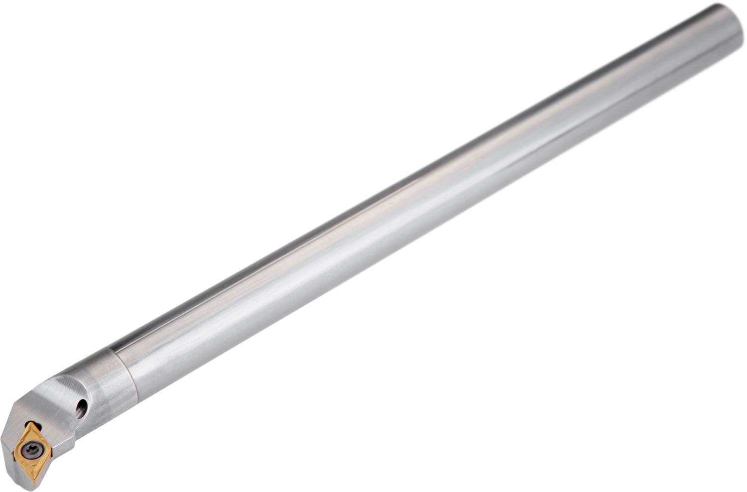 Screw clamp boring bar for holding a 55° rhombus positive insert with an inscribed circle diameter of 6.35mm, 2.38mm thick (ISO designation DC.. 0702.. ), right hand 93° end cutting with off-set shank, carbide with coolant hole, 12mm diameter x 180mm long for taper boring, single and multi-directional copy boring and longitudinal boring with and without shoulder