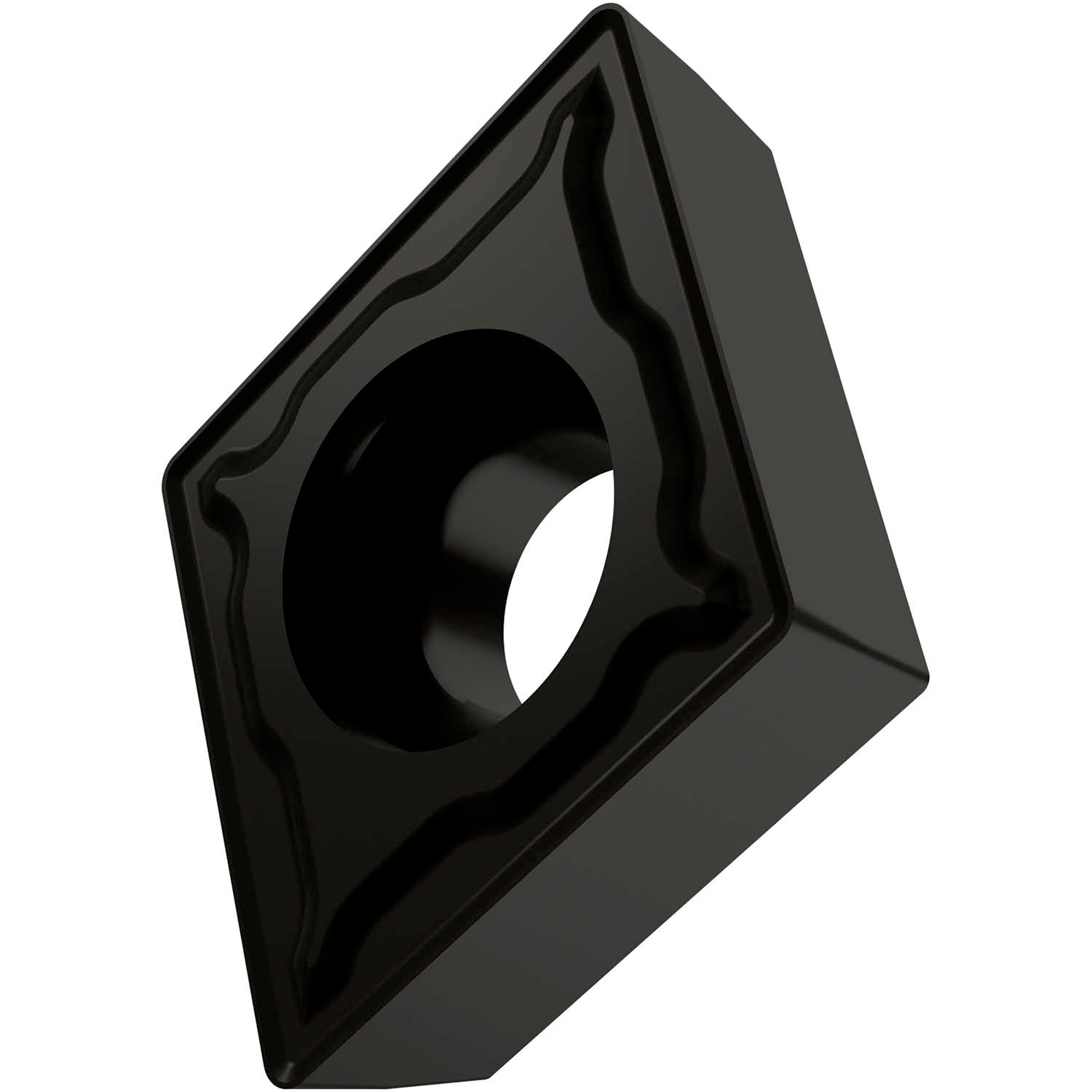 Single-sided positive turning insert, 75° rhomboid with 7° clearance, inscribed circle diameter of 7.94mm, 3.18mm thick, 0.4mm nose radius, indexing accuracy according to ISO-tolerance class-M, chip-breaker FM2 with rounded cutting edges, in grade T9335, a MT-CVD coated functionally graded WC-Co carbide within ISO range P20 -P45, for fine to medium machining of steels