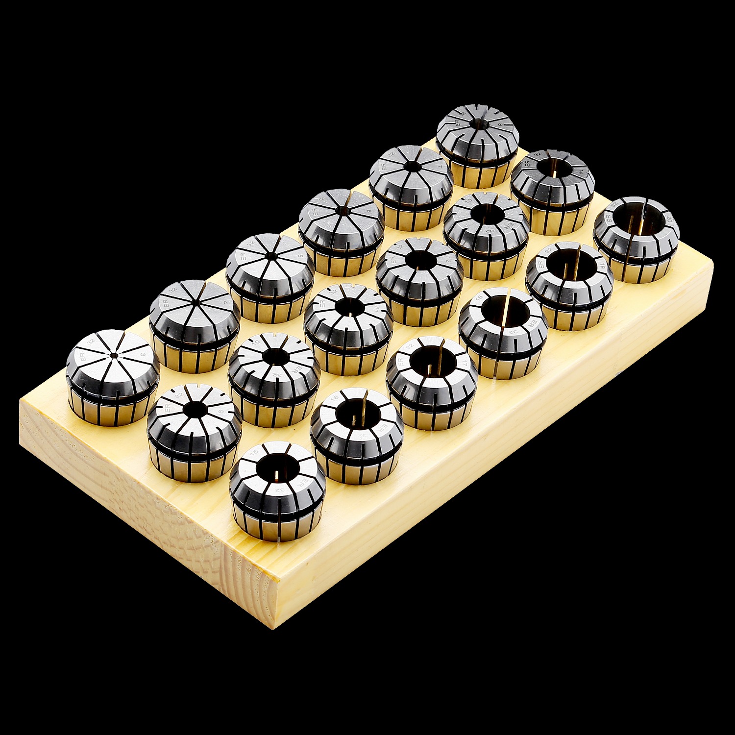 ER Sealed Collets With Tap Square Drive And 4 Coolant Holes – Set in Wooden Plate