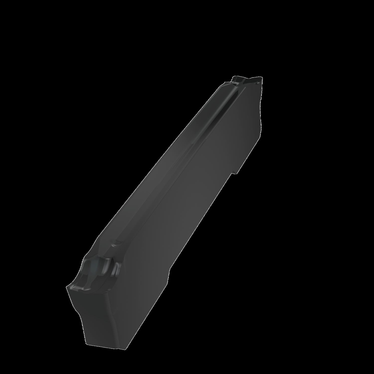Double ended parting and grooving insert, 25 mm long with a 2mm cutting width and 0.2mm corner radii, a cutting width tolerance of ±0.05. Grade T7325 MT-CVD coated functionally graded WC-Co carbide within ISO-grade range M10-M25 for machining of stainless-steel. PM geometry with highly positive rake, first choice for parting-off, and continuous to slightly interrupted cuts