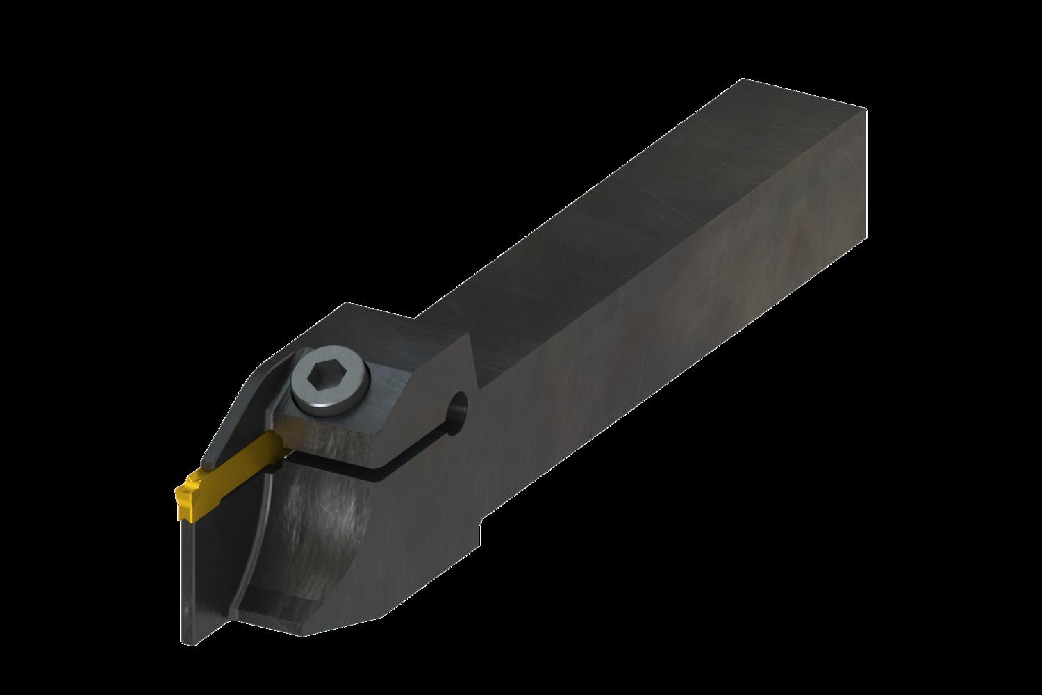 Top clamp grooving tool for holding a 25mm long double ended insert with 2-2.5mm cutting width (designation GL2-D… ), left handed with insert parallel to the shank for a maximum parting diameter of 45mm, shank height 16mm, width 16mm and tool length 125mm for multi-directional copy turning, shallow and deep radial grooving, radial groove turning, parting-off and tube parting-off