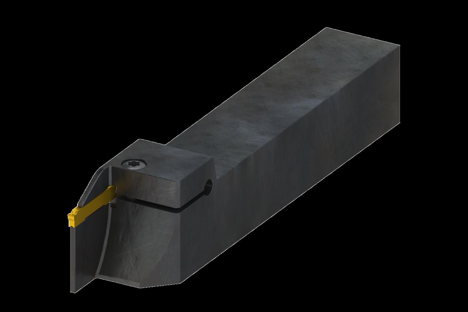 Top clamp grooving tool for holding a 25mm long double ended insert with 2-2.5mm cutting width (designation GL2-D… ), left handed with insert parallel to the shank for a maximum parting diameter of 80mm, shank height 25mm, width 25mm and tool length 150mm for multi-directional copy turning, shallow and deep radial grooving, radial groove turning, parting-off and tube parting-off
