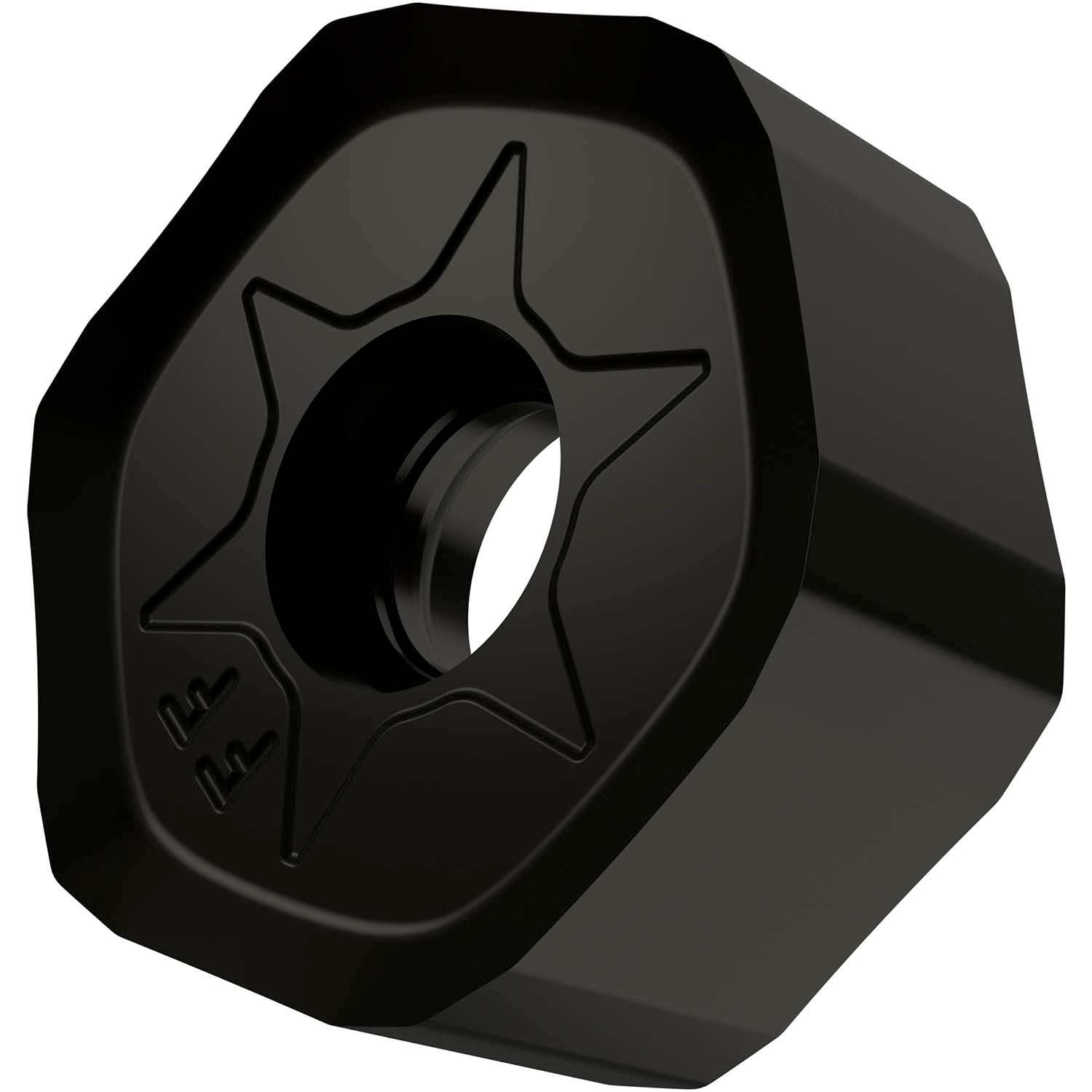 Double-sided milling insert HNGX 0906, hectagonal for a maximum depth of cut of 5.0mm, with an indexing accuracy according to ISO-tolerance class-G and FF geometry with rounded cutting edges, M9340 MT-CVD coated WC-Co carbide within ISO-grade ranges P35 -P50 and M30 -M40 for machining of steel and stainless-steel with face mills SHN09C