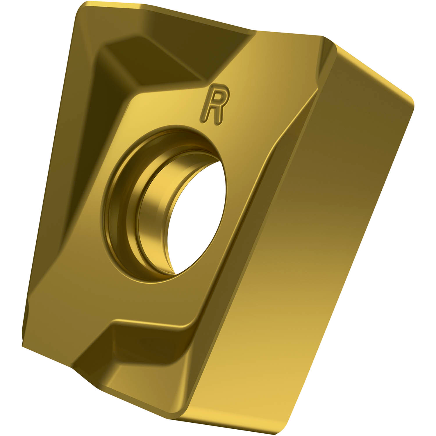 Double-sided milling insert LNMU 1607 with chip-breakers, rectangular for a maximum depth of cut of 13.0mm, with 1.6mm corner radius, an indexing accuracy according to ISO-tolerance class-M and R geometry with rounded cutting edges and facet, M8340 PVD coated fine grained WC-Co carbide within ISO-grade range P25 -P50 for machining of steel with shoulder mills SLN16
