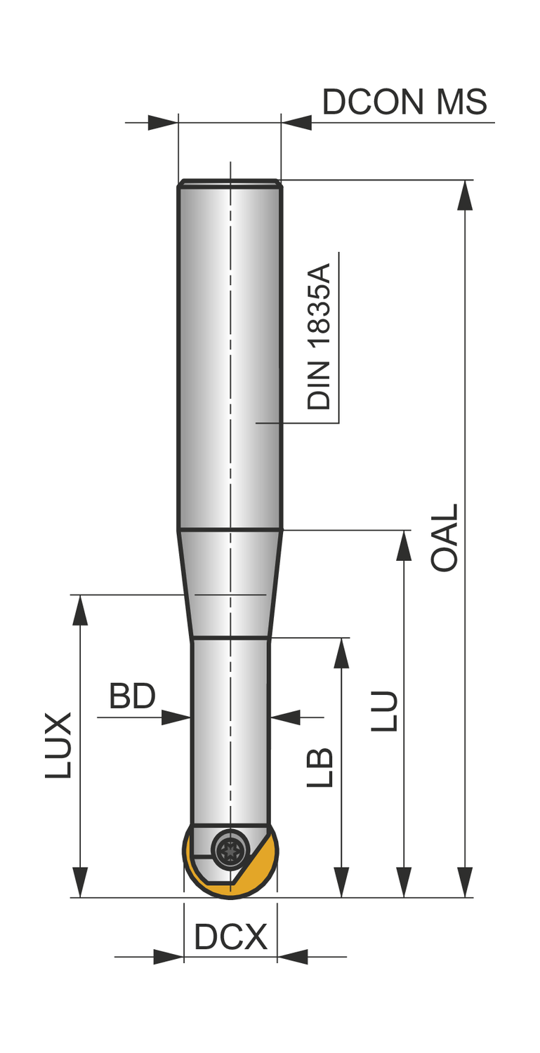 Copy end mill which utilises 1 of PPH 16.., PPHE 16.., PPHT 16.. or PPHF 16.. single-sided insert, cutting diameter 16mm with 16mm parallel shank according to DIN 1835A, 166mm overall length for copy milling with a maximum depth of cut of 0.3-4.0mm