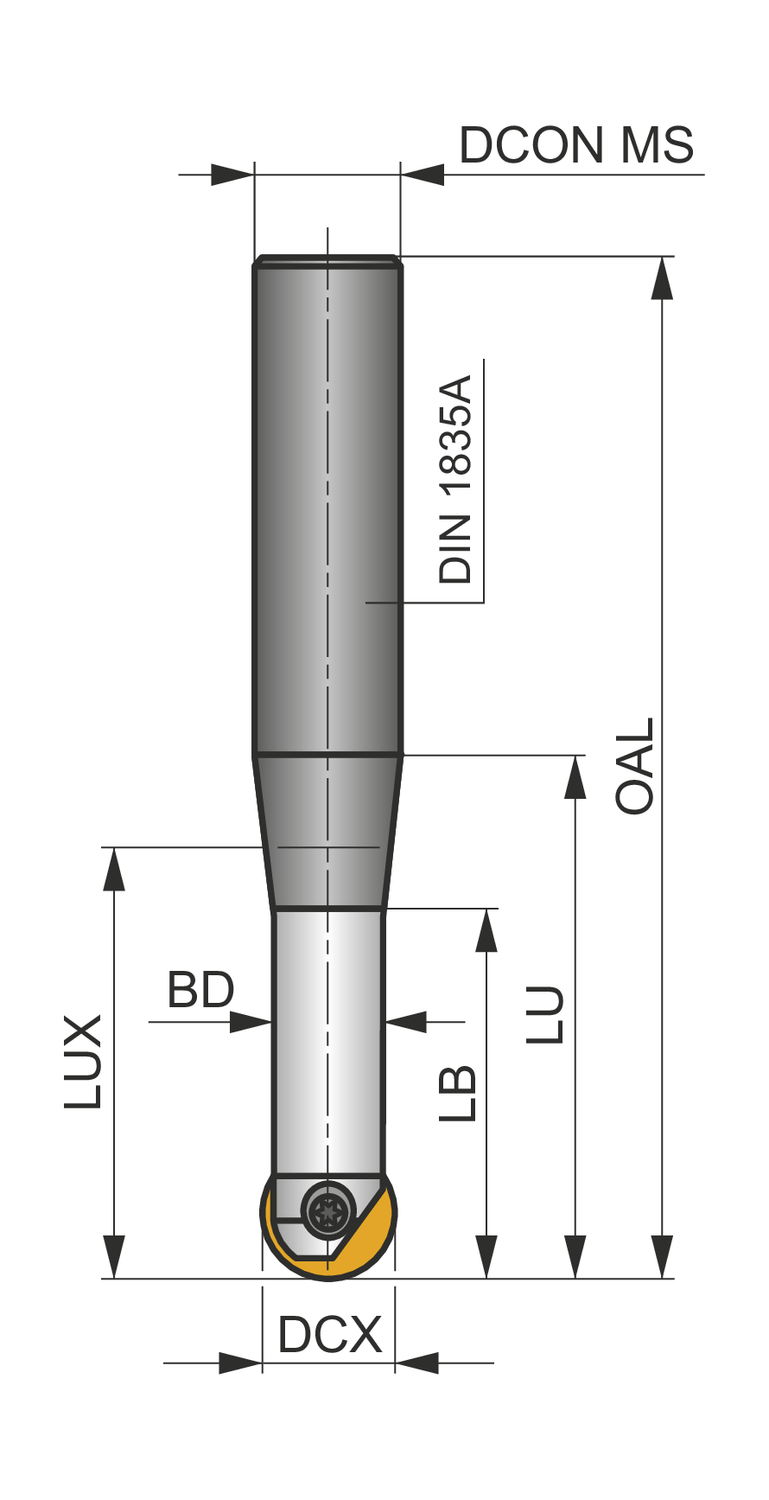 Copy end mill which utilises 1 of PPH 20, PPHE 20, PPHT 20 or PPHF 20 single-sided insert, cutting diameter 20mm with 20mm carbide parallel shank according to DIN 1835A, 104mm overall length for copy milling with a maximum depth of cut of 0.3-4.0mm