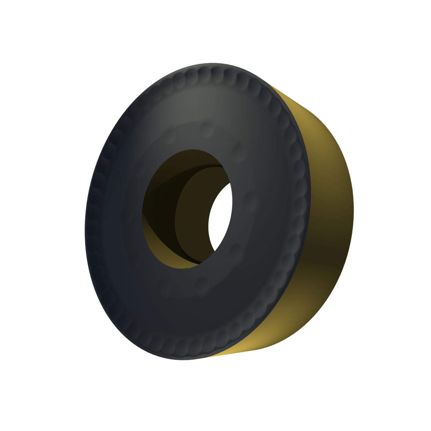 Special design positive turning insert, round with 7° clearance, a diameter of 20 mm, 6.35mm thick, indexing accuracy according to ISO-tolerance class-M, chip-breaker RM1, in grade T9415, a MT-CVD coated functionally graded WC-Co carbide within ISO range P05 -P30, for heavy to medium machining of steels
