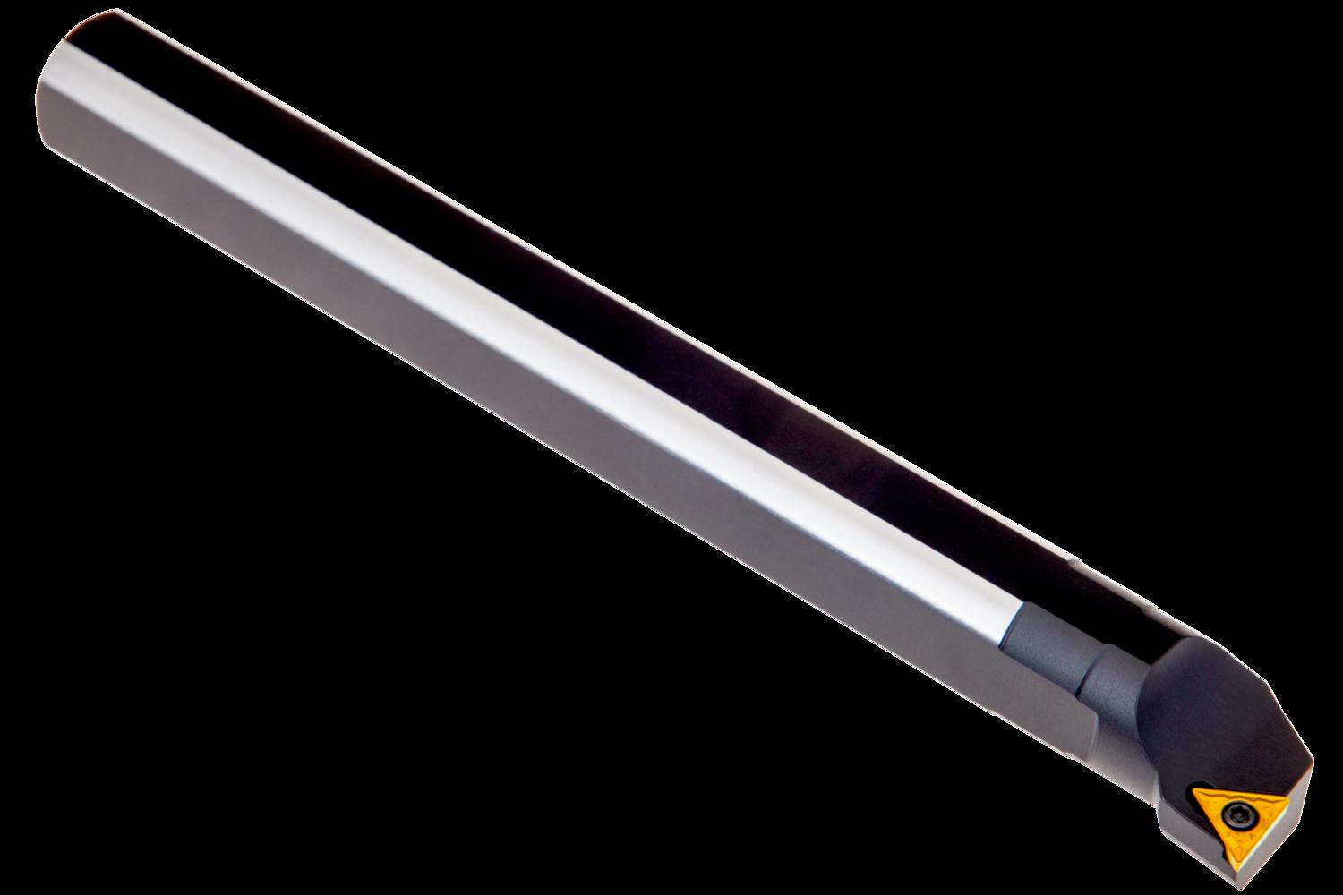 Screw clamp boring bar for holding a triangular positive insert with an inscribed circle diameter of 6.35mm, 2.38mm thick (ISO designation TC.. 1102.. ), left hand 90° end cutting with off-set shank, steel without coolant hole, 12mm diameter x 125mm long for taper boring and longitudinal boring with and without shoulder