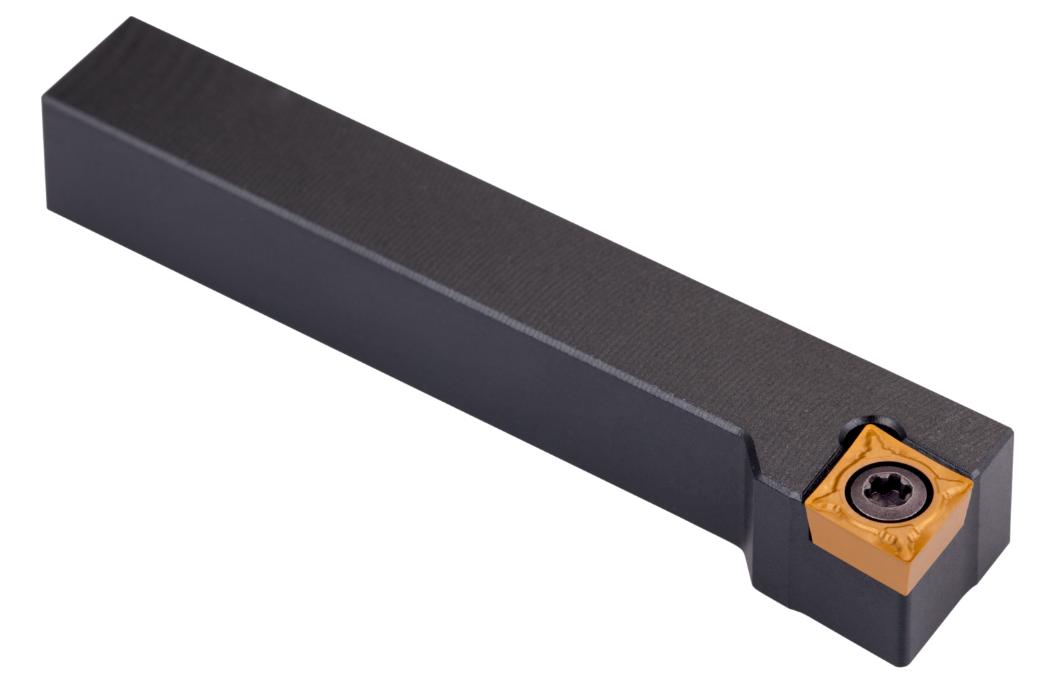 Screw clamp turning tool for holding a 80° rhombus positive insert with an inscribed circle diameter of 9.525mm, 3.97mm thick (ISO designation CC.. 09T3.. ), left hand 95° side and end cutting with off-set shank, 12mm tool height x 12mm width x 80mm long for chamfering, taper turning, face turning with and without shoulder and longitudinal turning with and without shoulder
