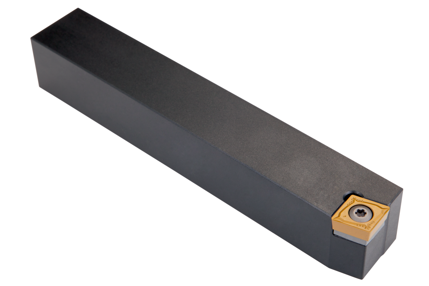 Screw clamp turning tool also compatible with sliding head machines for holding a 80° rhombus positive insert with an inscribed circle diameter of 9.525mm, 3.97mm thick (ISO designation CC.. 09T3.. ), right hand 95° side and end cutting with off-set shank, 16mm tool height x 16mm width x 125mm long for chamfering, taper turning, face turning with and without shoulder and longitudinal turning with and without shoulder