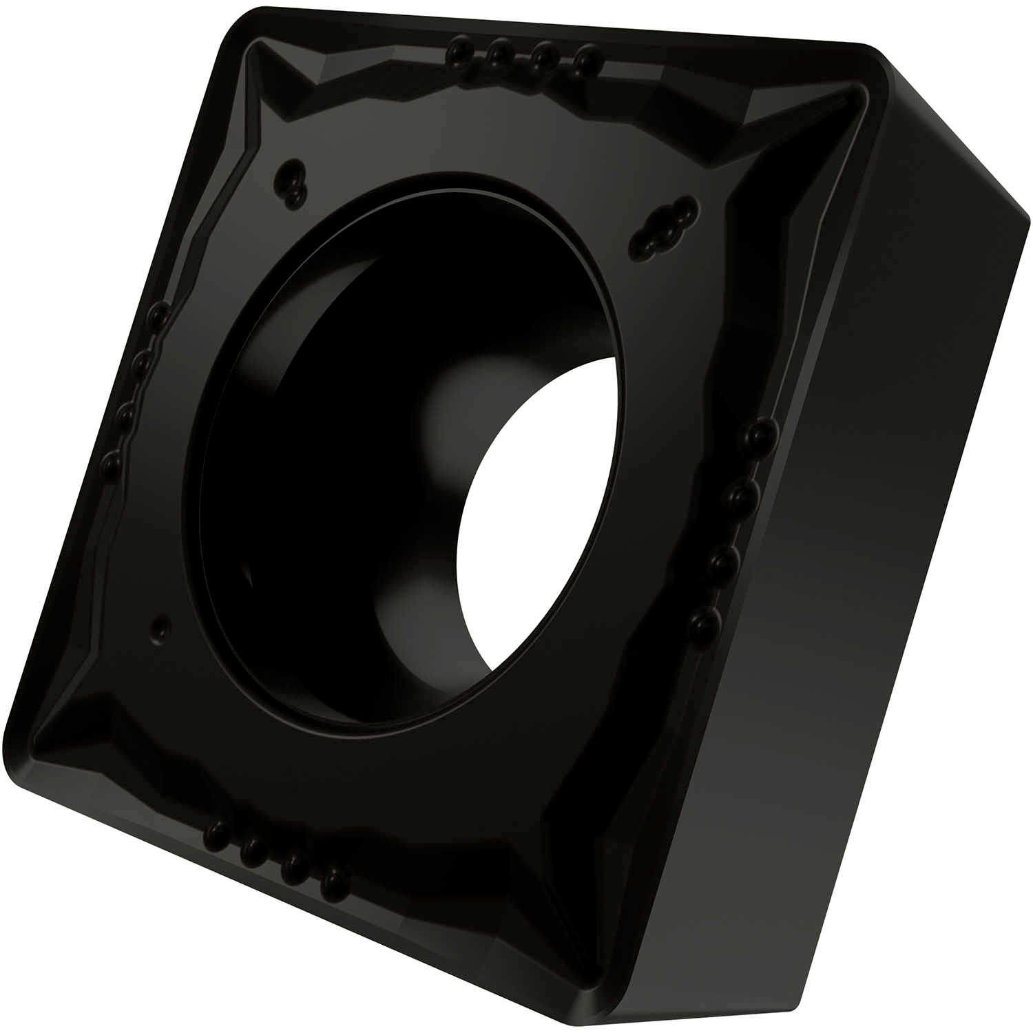 Single-sided positive turning insert, square with 7° clearance, inscribed circle diameter of 9.525mm, 3.97mm thick, 0.4mm nose radius, indexing accuracy according to ISO-tolerance class-M, chip-breaker FM with rounded cutting edges, in grade T9325, a MT-CVD coated functionally graded WC-Co carbide within ISO ranges P15 -P35 and M10 -M30, for fine to medium machining of steels and stainless-steels