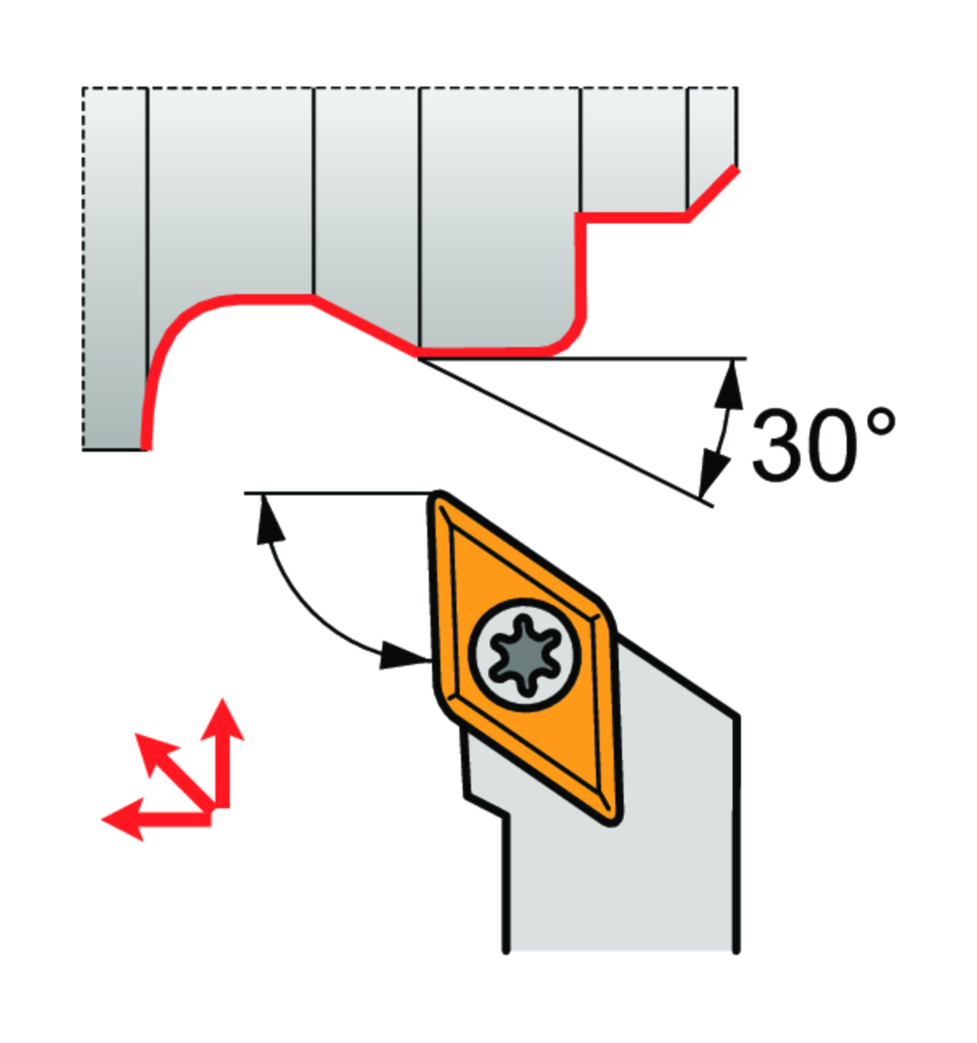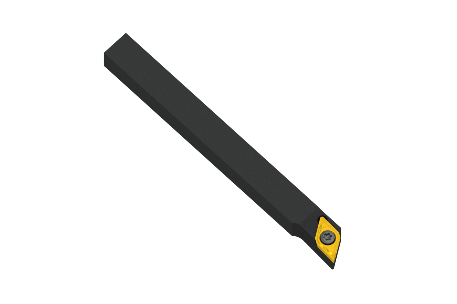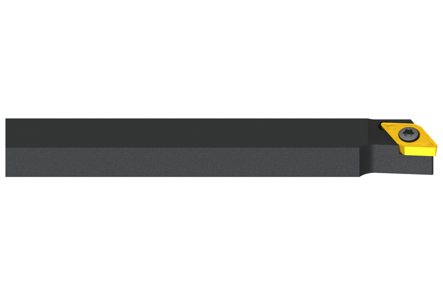 Screw clamp turning tool also compatible with sliding head machines for holding a 55° rhombus positive insert with an inscribed circle diameter of 9.525mm, 3.97mm thick (ISO designation DC.. 11T3.. ), left hand 93° side cutting with off-set shank, 12mm tool height x 12mm width x 125mm long for chamfering, taper turning, single and multi-directional copy turning and longitudinal turning with and without shoulder