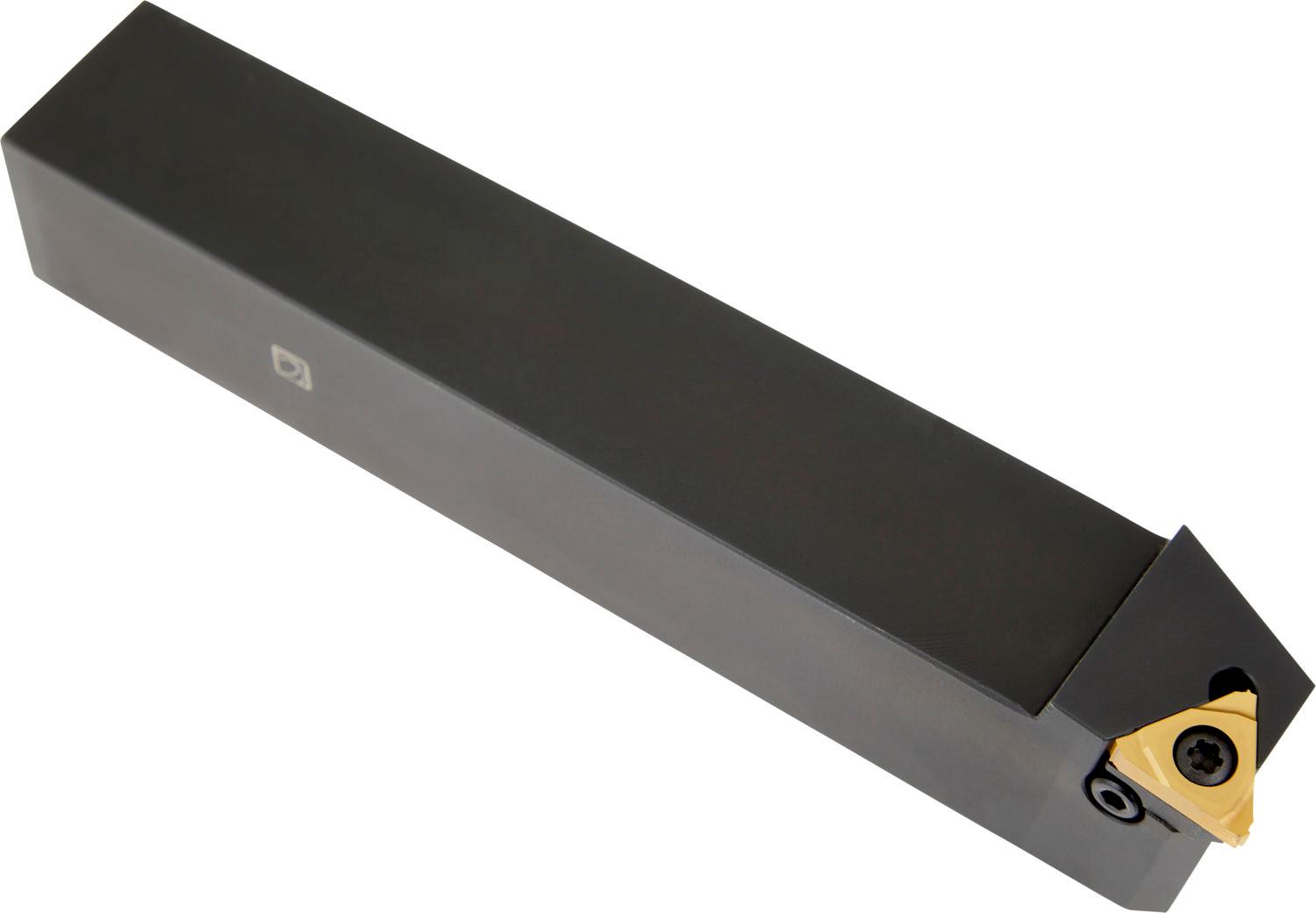 Screw clamp thread turning tool with 1.5° helix angle for holding a triangle shaped insert with an inscribed circle diameter of 9.525mm (designation TN 16EL.. ), left hand standard design with straight shank, 25mm tool height, 25mm width and 150mm overall length for external threading, circlip grooving, and o-ring grooving