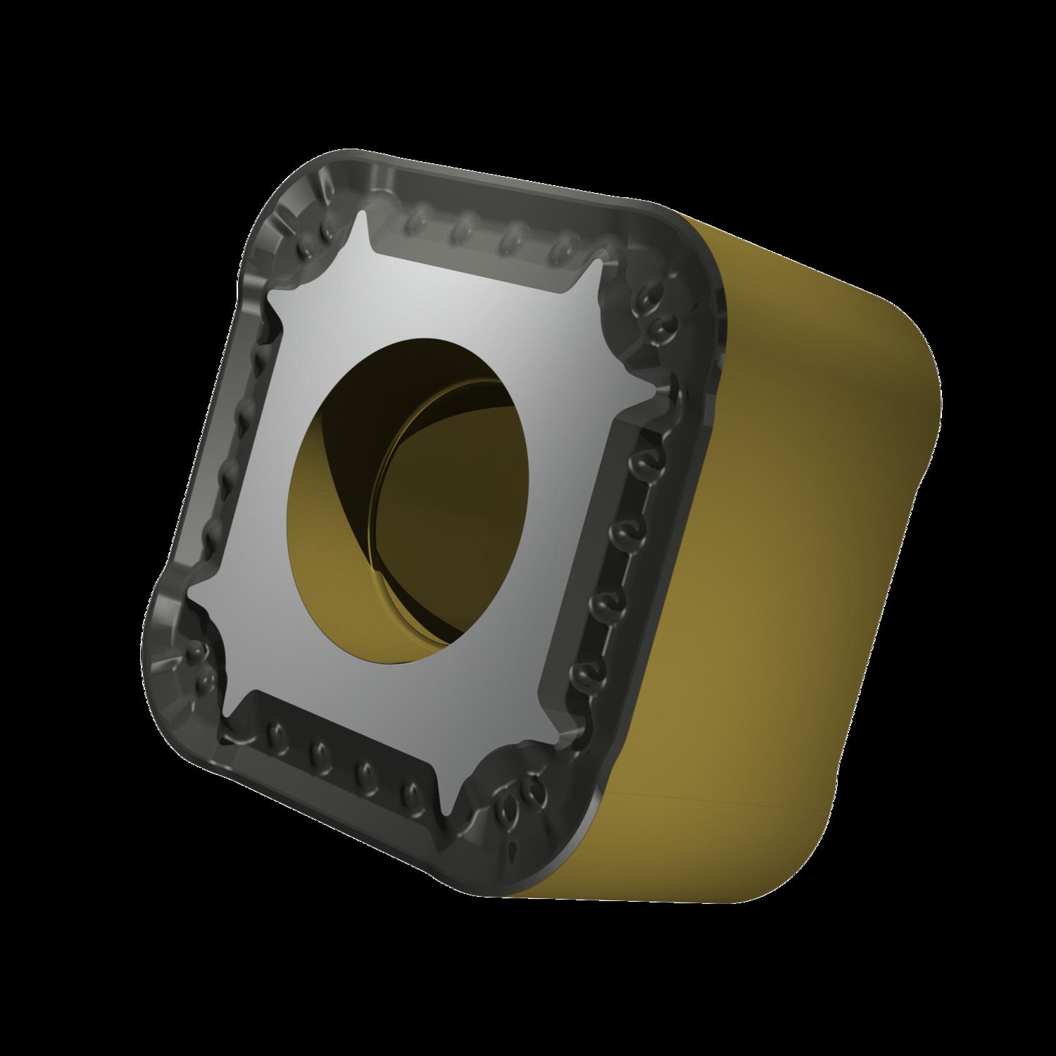 Special design negative turning insert, square with inscribed circle diameter of 19.05mm, 11mm thick, 4mm nose radius, indexing accuracy according to ISO-tolerance class-M, chip-breaker TF with rounded cutting edges with facet, in grade T9415, a MT-CVD coated functionally graded WC-Co carbide within ISO range P05 -P30, for heavy to medium machining of steels