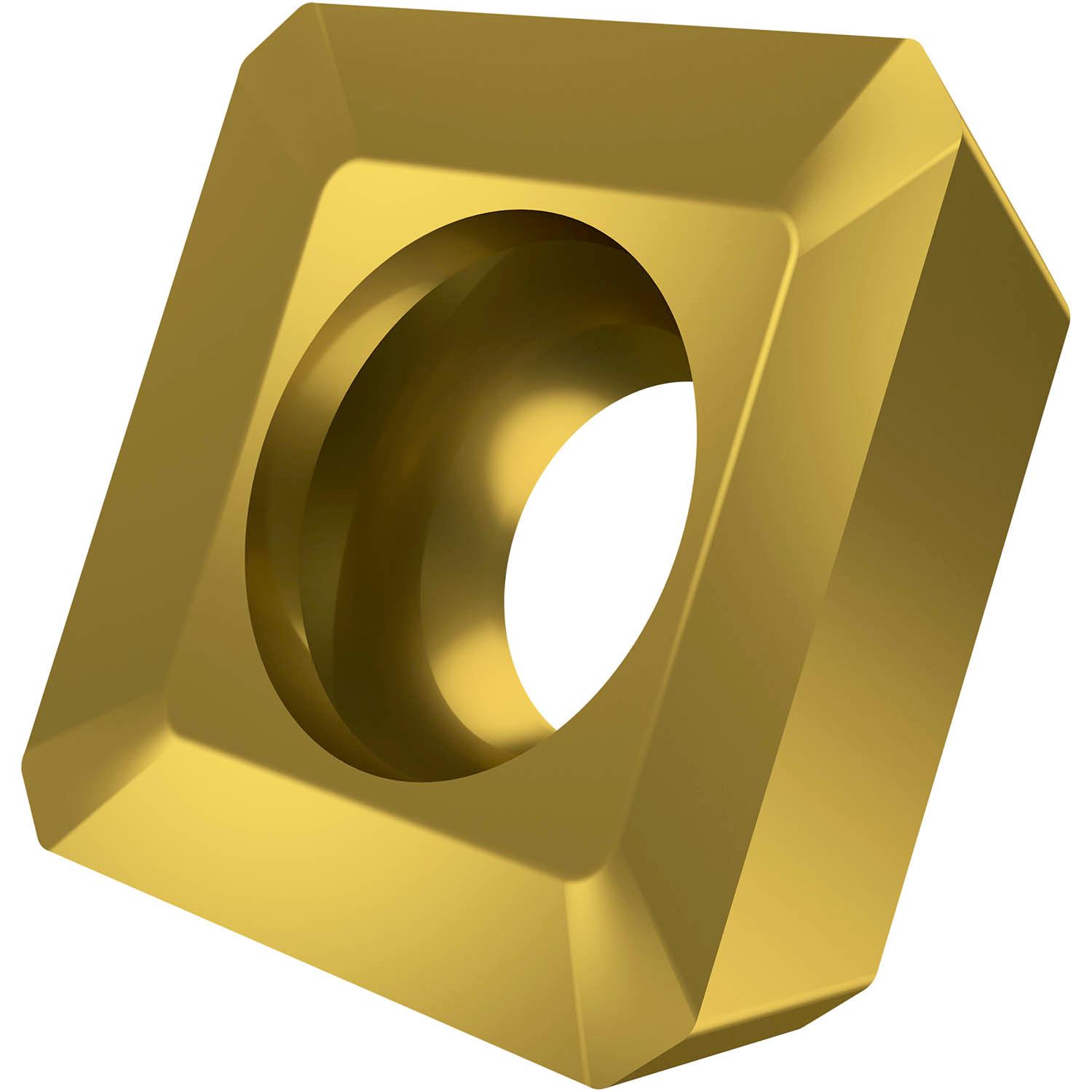Single-sided milling insert SPET 1204 with chip-breakers, square for a maximum depth of cut of 12.0mm, with an indexing accuracy according to ISO-tolerance class-E with rounded cutting edges, M8340 PVD coated fine grained WC-Co carbide within ISO-grade range P25 -P50 for machining of steel with shoulder mills with extended flute J(T)-SSAP
