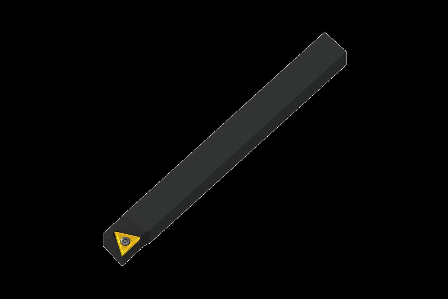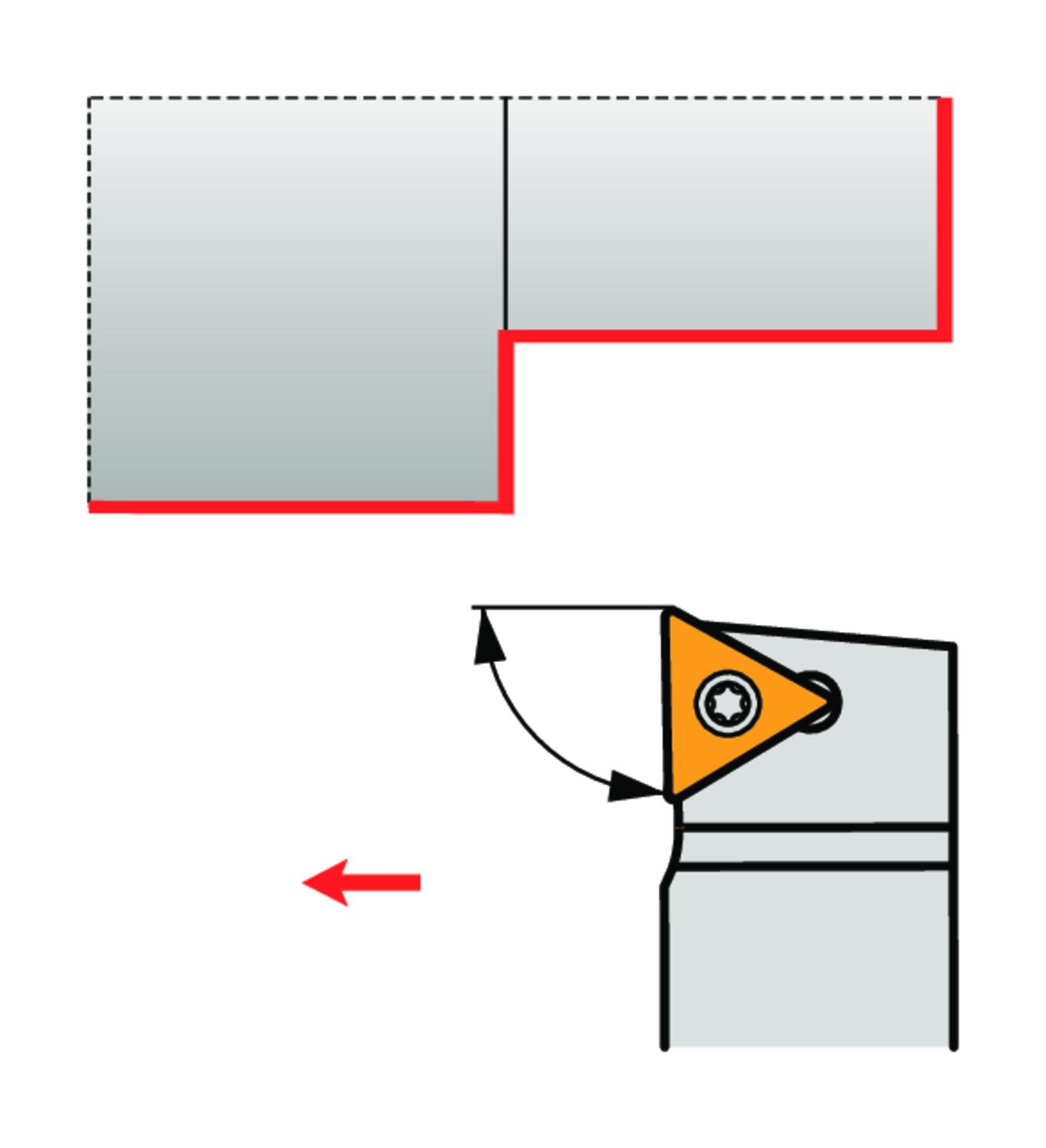 Screw clamp turning tool also compatible with sliding head machines for holding a triangular positive insert with an inscribed circle diameter of 6.35mm, 2.38mm thick (ISO designation TC.. 1102.. ), right hand 90° side cutting with straight shank, 12mm tool height x 12mm width x 125mm long for taper turning and longitudinal turning with and without shoulder