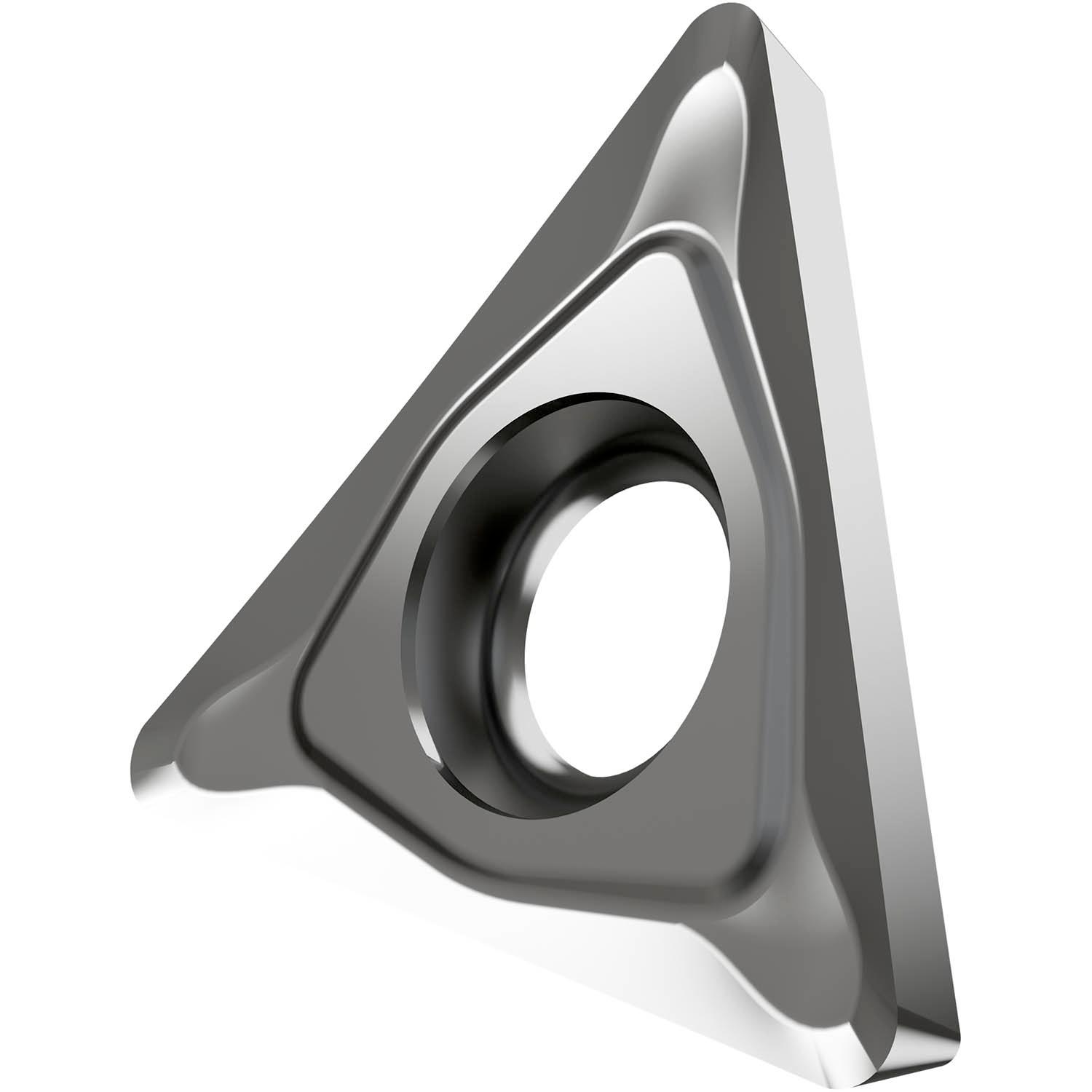 Single-sided positive turning insert, triangular with 7° clearance, inscribed circle diameter of 9.525mm, 3.97mm thick, 0.8mm nose radius, indexing accuracy according to ISO-tolerance class-G, chip-breaker AL with sharp cutting edges, in grade HF7, an uncoated fine grained WC-Co carbide within ISO range N10 -N25, for fine to heavy machining of non-ferrous metals