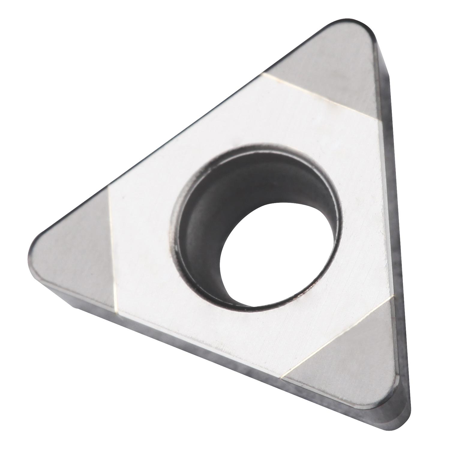 Insert for hard turning with 3 CBN tipped corners on one-side, triangular with 7° clearance, inscribed circle diameter of 6.35mm, 2.38mm thick, 0.4mm nose radius, indexing accuracy according to ISO-tolerance class-G, rounded cutting edges, in grade TB310, an uncoated cubic boron nitride within ISO range H01 -H10, for high-speed machining of hardened materials
