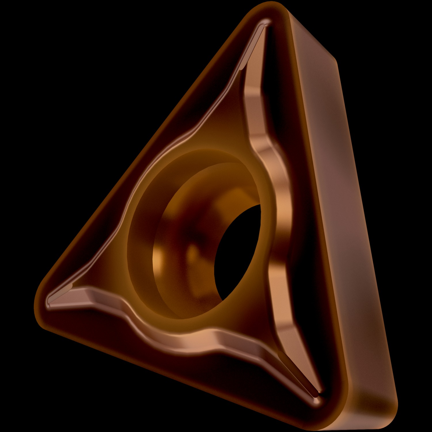 Single-sided positive turning insert, triangular with 7° clearance, inscribed circle diameter of 6.35mm, 2.38mm thick, 0.4mm nose radius, indexing accuracy according to ISO-tolerance class-M, chip-breaker FF2 with rounded cutting edges, in grade T8430, a PVD coated fine grained WC-Co carbide within ISO range P20 -P40, for fine to medium machining of steels