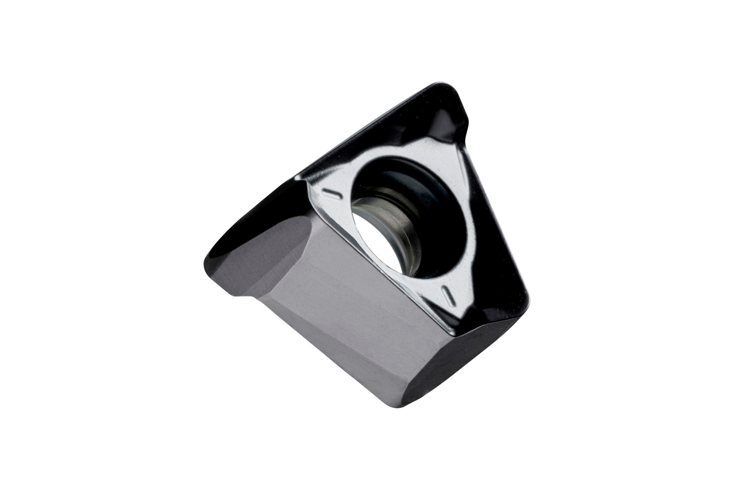 Double-sided milling insert TNGX 1004, triangular for a maximum depth of cut of 5.0mm, with 0.8mm corner radius, an indexing accuracy according to ISO-tolerance class-G and F geometry with rounded cutting edges and facet, 8215 PVD coated fine grained WC-Co carbide within ISO-grade range P10 -P20 for machining of steel with shoulder face mills STN10