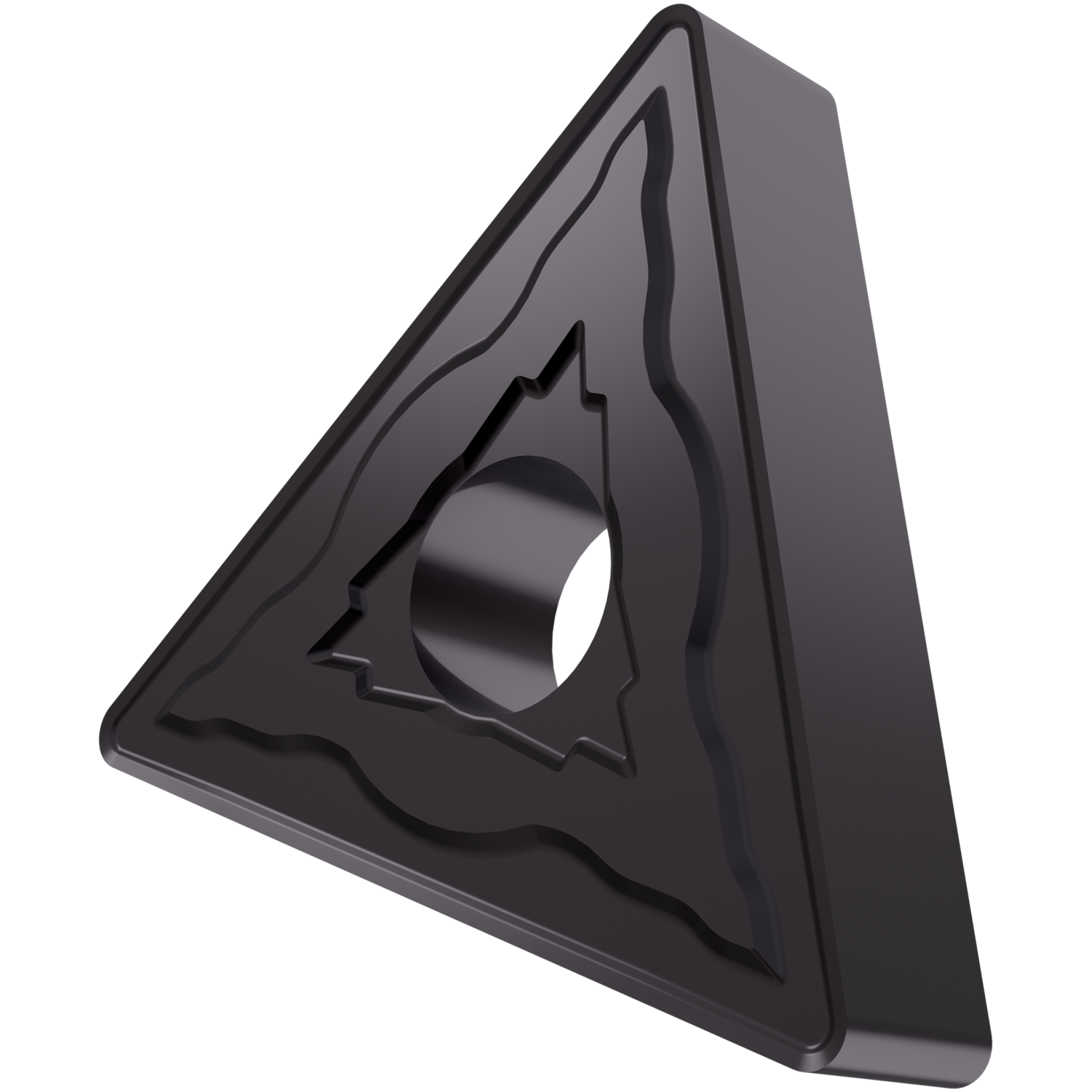 Double-sided negative turning insert, triangular with inscribed circle diameter of 9.525mm, 4.76mm thick, 0.8mm nose radius, indexing accuracy according to ISO-tolerance class-M, chip-breaker NMR with rounded cutting edges, in grade T6310, a PVD coated extra fine grained WC-Co carbide within ISO ranges P01 -P15/M01 -M15 and S01 -S15, for fine to heavy machining of steels, stainless-steels and super-alloy