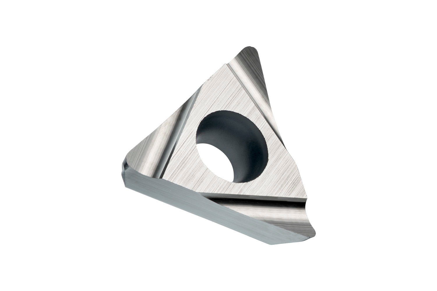 Special design positive turning insert, triangular with 11° clearance, inscribed circle diameter of 5.56mm, 2.38mm thick, 0.4mm nose radius, indexing accuracy according to ISO-tolerance class-G, chip-breaker JQ with sharp cutting edges, in grade TT010, an uncoated cermet within ISO range P01 -P10, for fine machining of steels with a left handed turning tool
